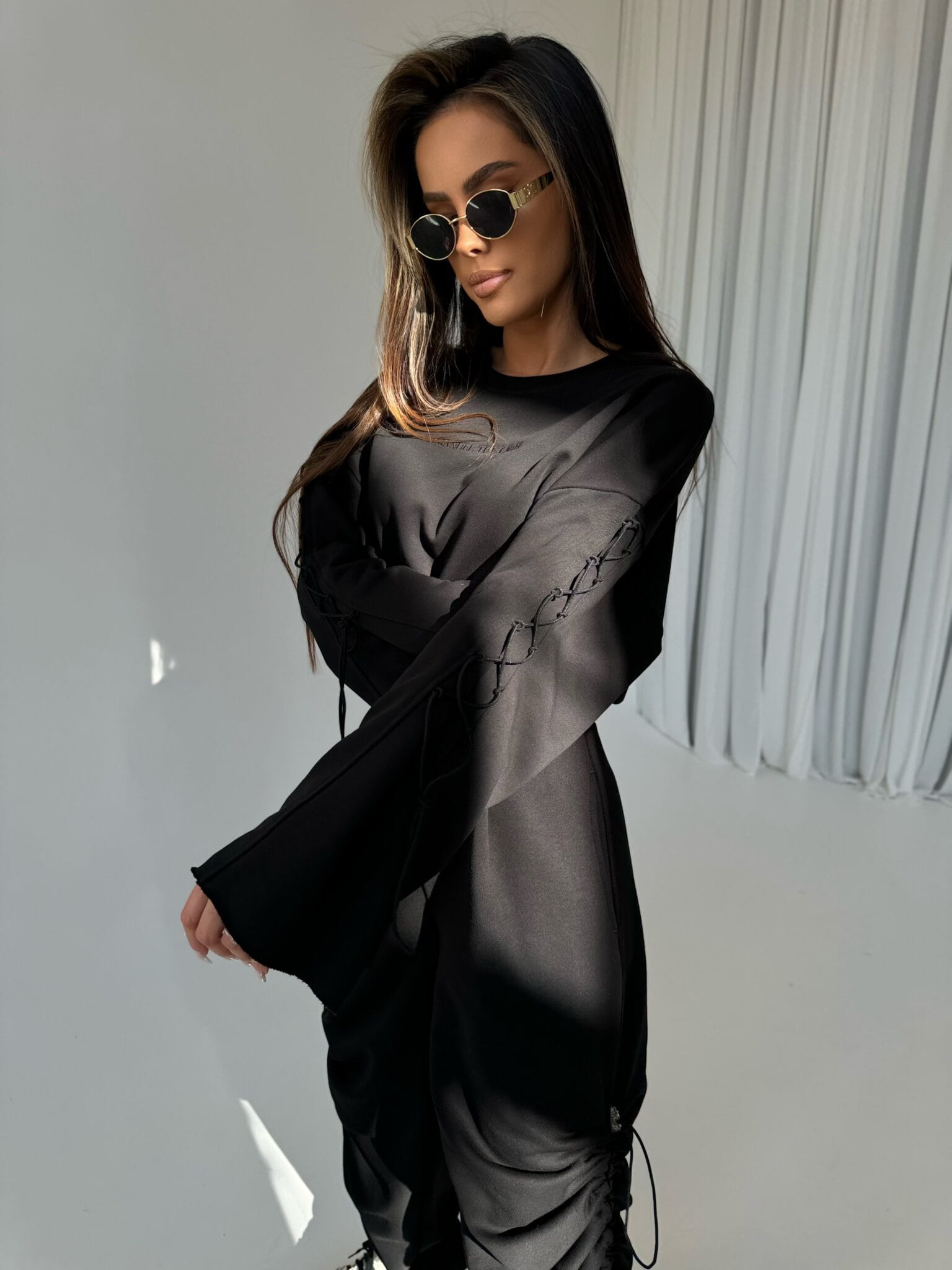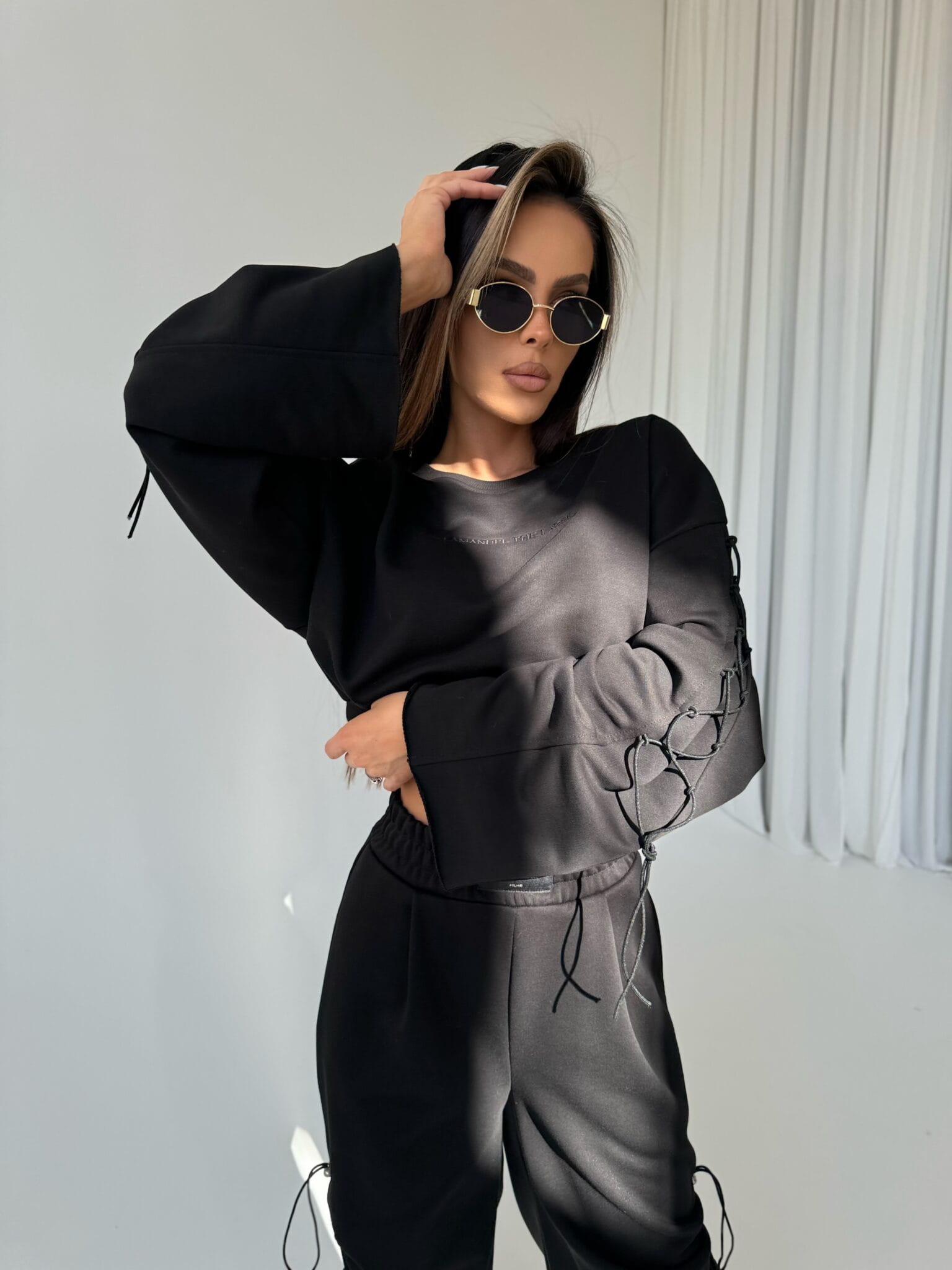 Bluza damska bez kaptura o unikalnym, nowoczesnym kroju, która wyróżnia się długimi rękawami ściąganymi sznurkiem. Na rękawach sznurki z regulacją dodaje całości modnego, dynamicznego wyglądu. Bluza wykonana z przyjemnego w dotyku, miękkiego materiału zapewnia wygodę noszenia przez cały dzień. Klasyczny, prosty fason sprawia, że jest wszechstronna i łatwa do stylizacji – świetnie sprawdzi się zarówno w casualowych, jak i bardziej sportowych zestawach. Idealnie pasują do zestawu z naszymi spodniami ULTIMATE!