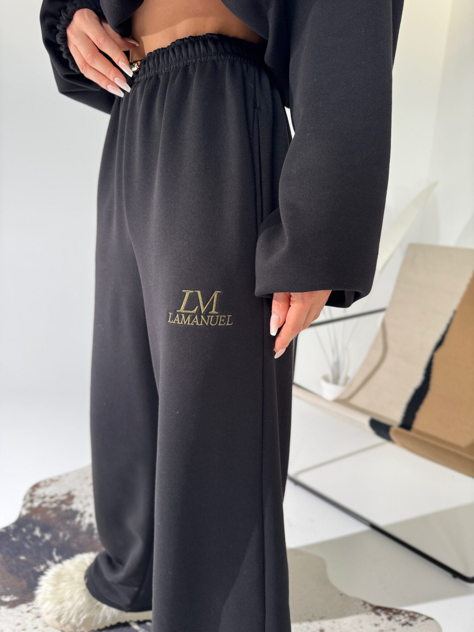 Luźne, wygodne spodnie z prostą nogawką i elastycznym pasem. Złoty detal w talii dodaje im lekkiego wyrafinowania, a haft z logo podkreśla charakter marki. Idealne do noszenia na co dzień – solo albo w komplecie.