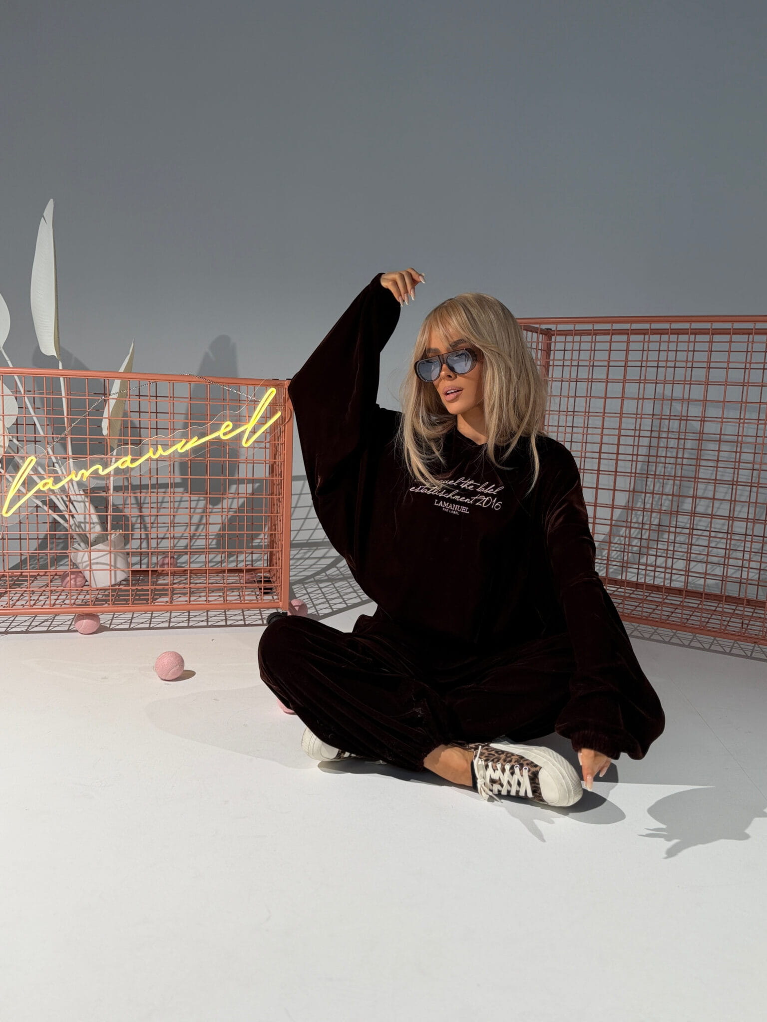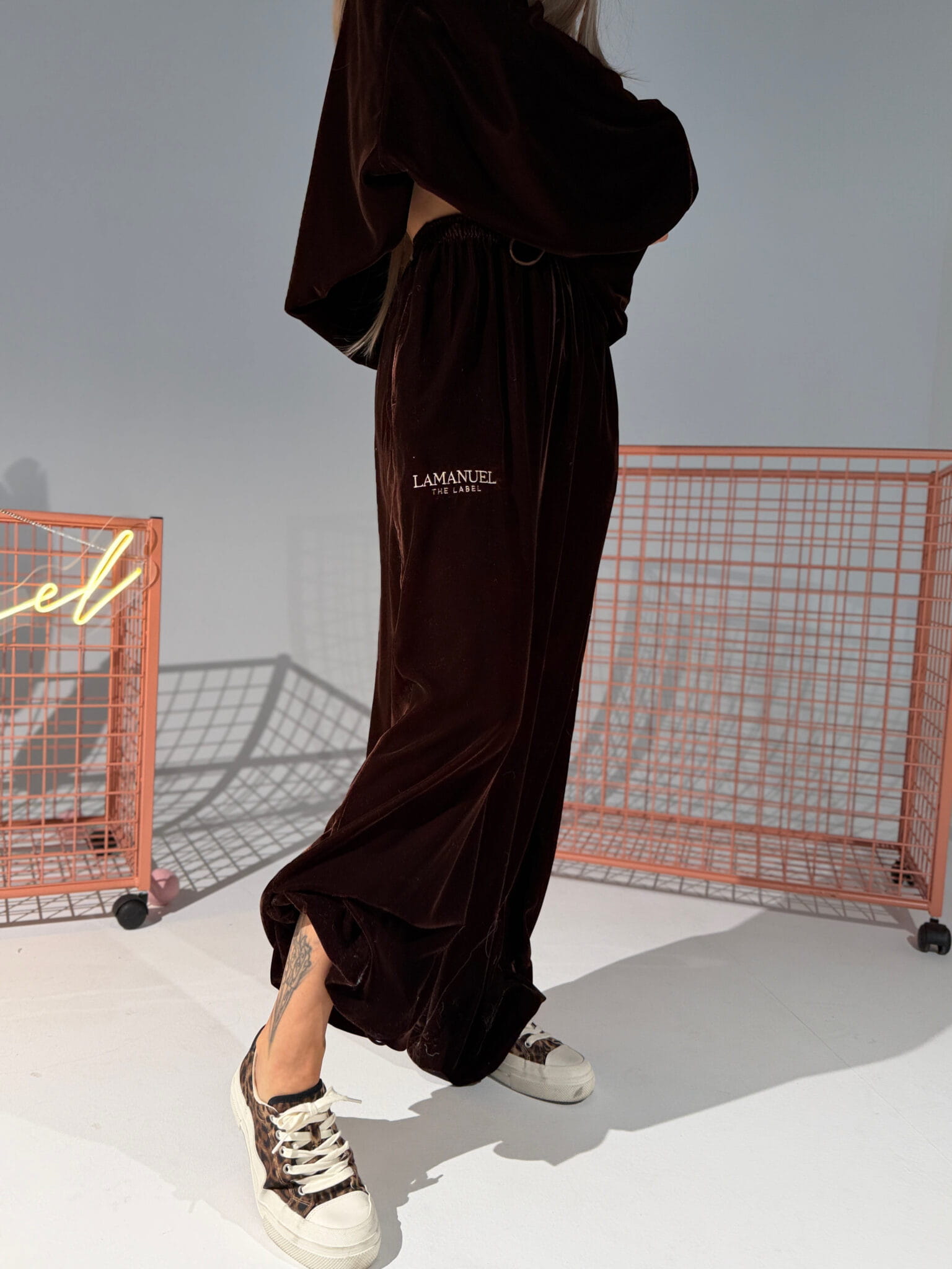 Aksamitna dzianina z delikatnym refleksem – gładka, przyjemna w dotyku, ale bez zbędnego połysku. Wysoki stan, szeroka guma w pasie i dodatkowa regulacja sznurkiem. Nogawki proste, lekko lejące, z możliwością ściągnięcia na dole dzięki ukrytej gumce. Na biodrze haft – detal, który robi różnicę. Subtelny, ale wyczuwalny. Te spodnie wyglądają stylowo nawet w połączeniu z basicowym topem. Efekt jak z setu, nawet gdy nosisz je solo.