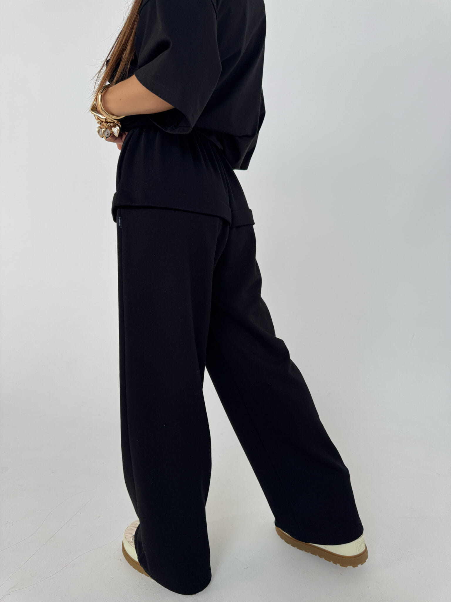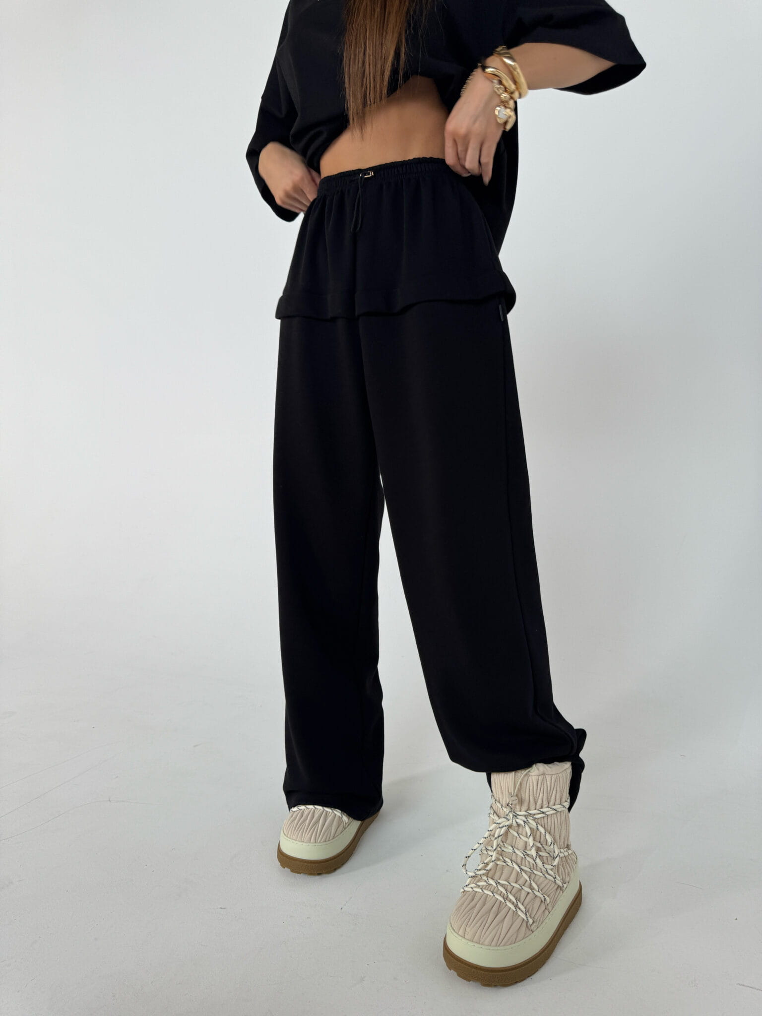Luźne spodnie z miękkiej dzianiny dresowej. Wysoki stan z elastyczną talią i troczkiem, kieszenie boczne oraz ozdobny pasek z przeszyciem na wysokości bioder. Komfortowy fason idealny do codziennych i domowych stylizacji.