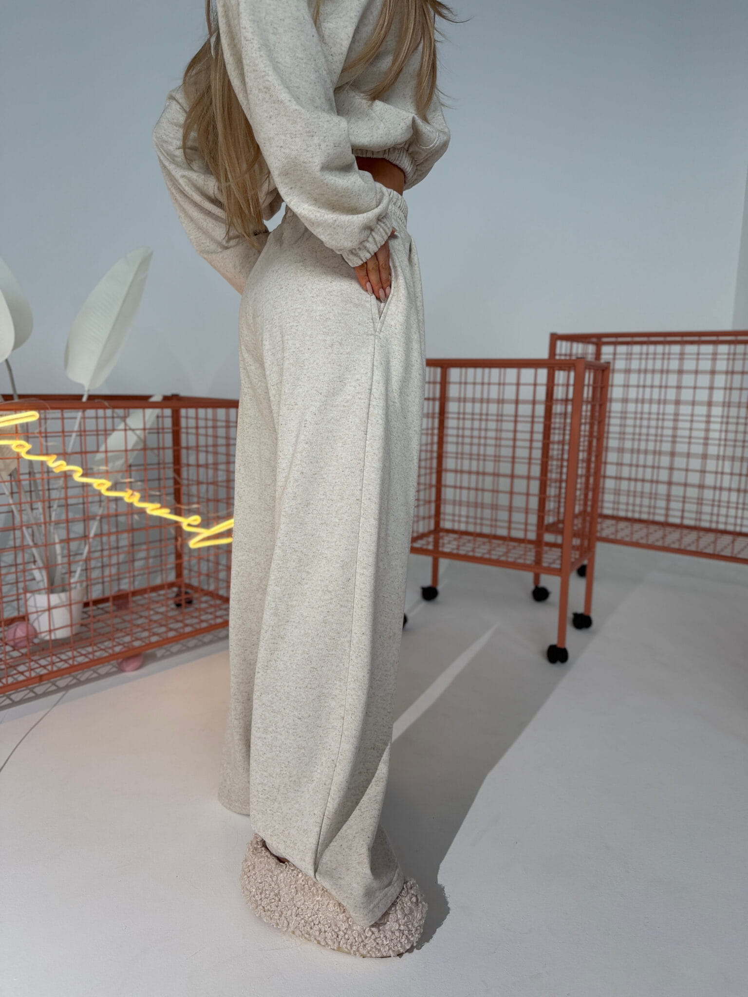 Wysoki stan, elastyczna guma i cienki sznurek z metalowym wykończeniem. Nogawka szeroka, długa, prowadzona prosto. Materiał lekko pracuje w ruchu, bez efektu obciążenia. Drobne zakładki w pasie nadają formę w biodrach. Duży haft na jednej nogawce – spójny z bluzą, ale działa też osobno. Klasyczny dres z wykończeniem, które robi różnicę.