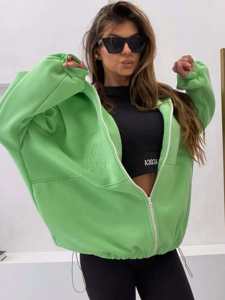 Zapinana na zamek, z kapturem oraz subtelnym haftowanym logo na przodzie. Dół regulowany stoperami.