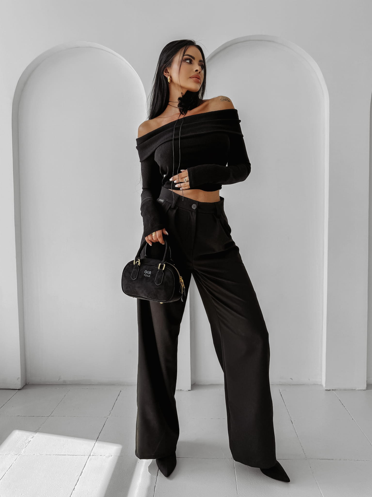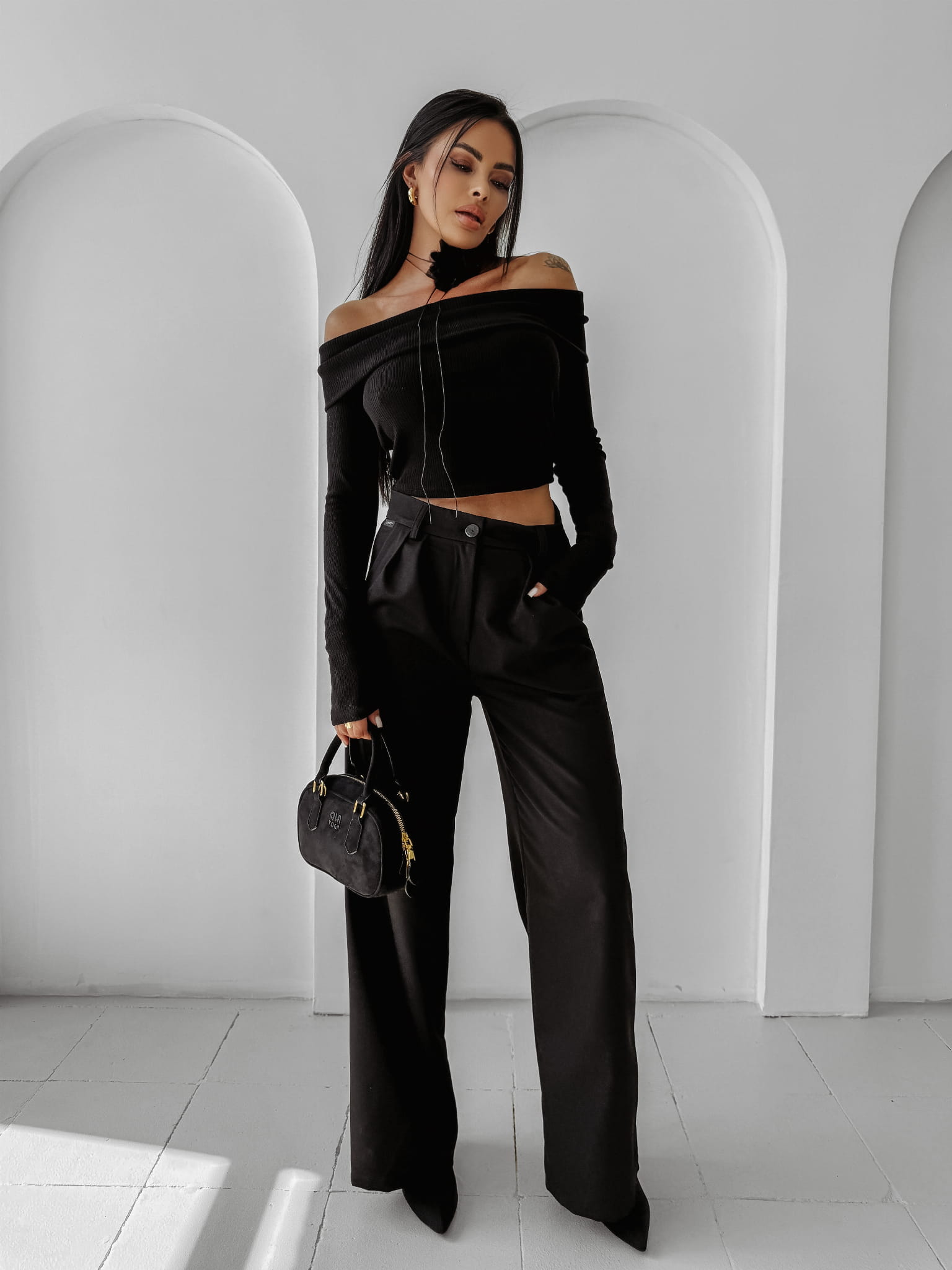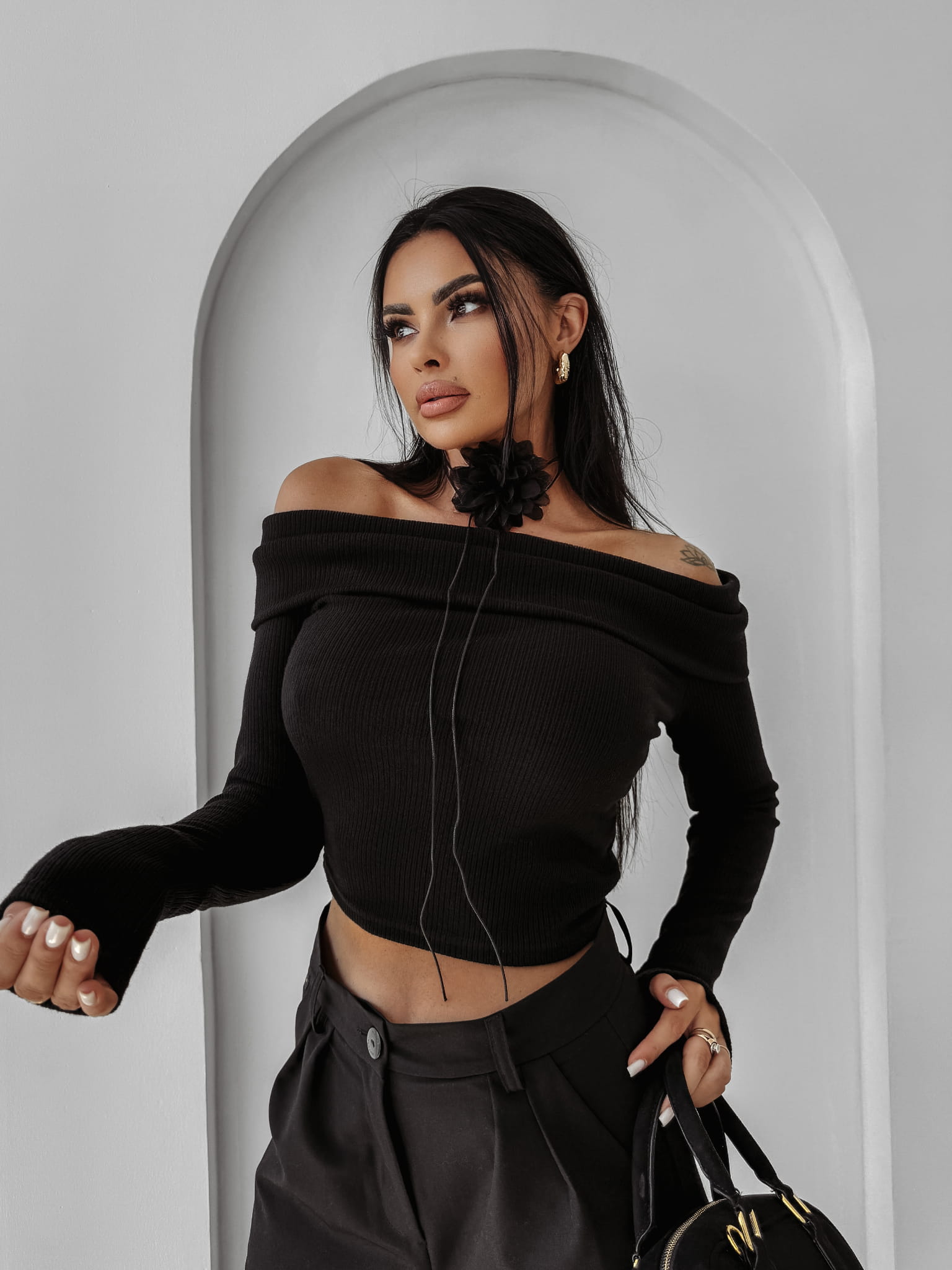 Bluzka z długim rękawem, o dopasowanym kroju z odkrytymi ramionami. Wykonana z elastycznego, prążkowanego materiału. Krótszy fason subtelnie podkreśla talię. Na boku wszyta metka z logo marki OLAVOGA.