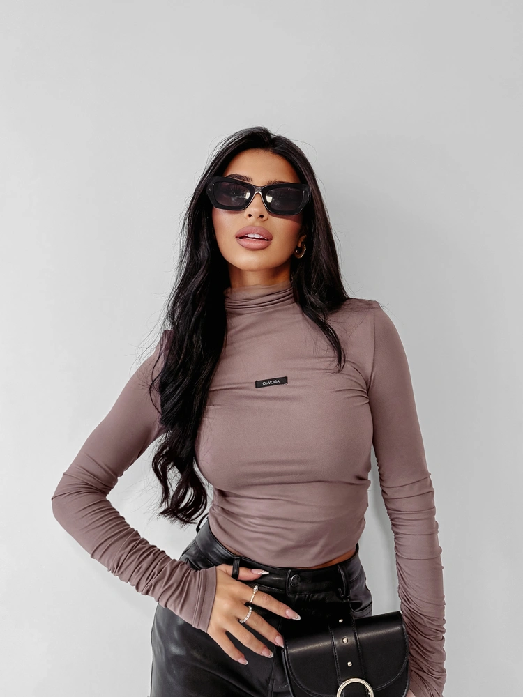 Dopasowana bluzka z długim rękawem i elegancką stójką. Wykonana z wysokiej jakości elastycznego materiału. Subtelne marszczenie na rękawach. Na przodzie minimalistyczna, czarna metka z logo marki OLAVOGA.