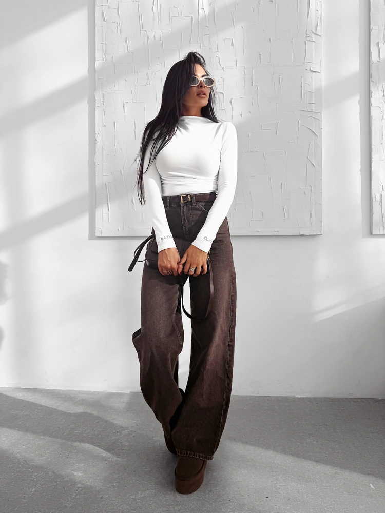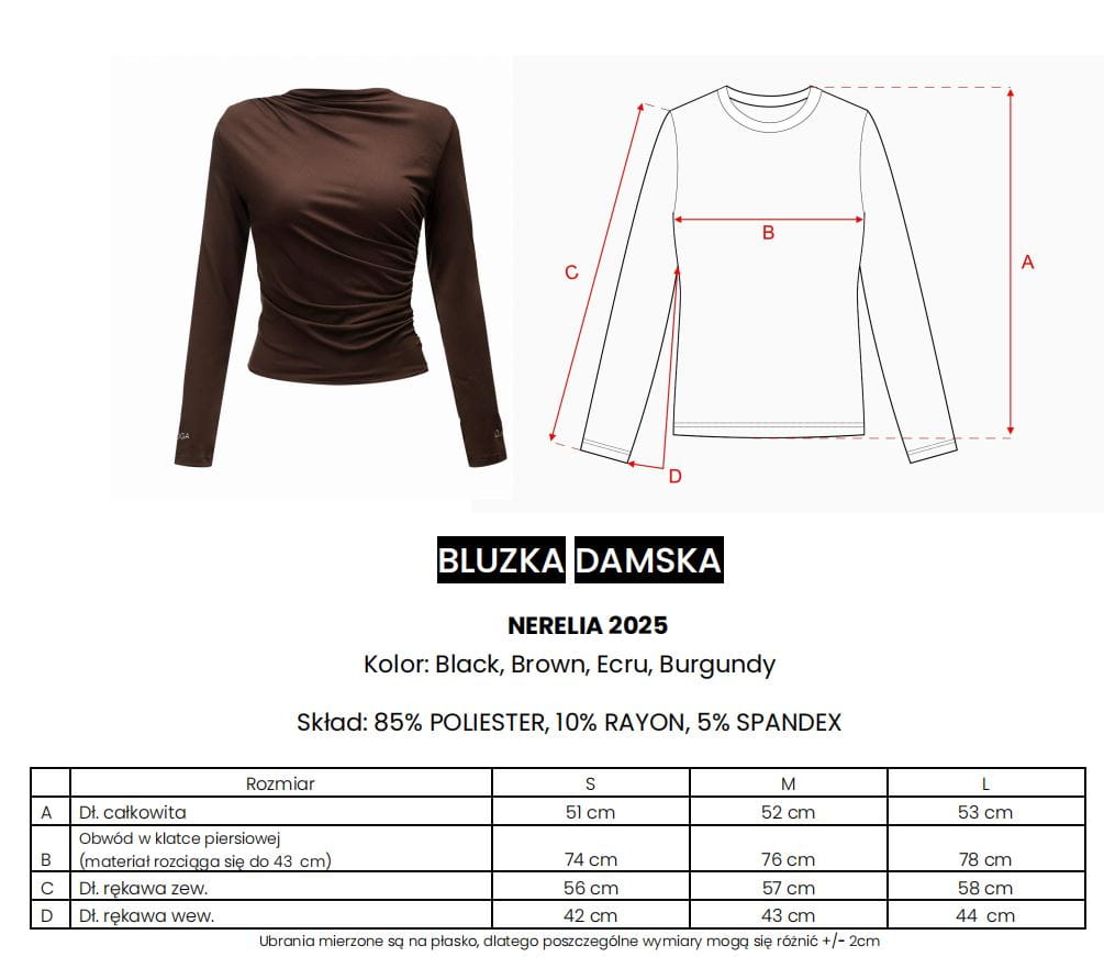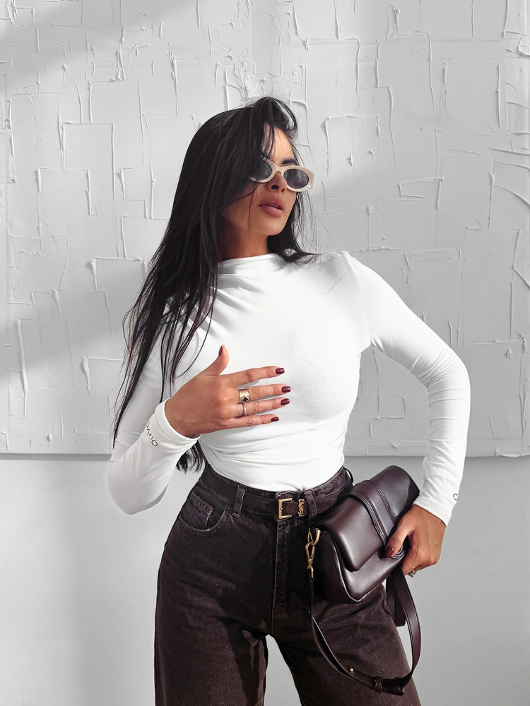 Przylegająca bluzka z długim rękawem z eleganckim półgolfem i subtelnymi marszczeniami po bokach. Wykonana z wysokiej jakości elastycznego oraz gładkiego materiału o satynowym wykończeniu. Na obu rękawach zdobi ją haftowane logo marki OLAVOGA.