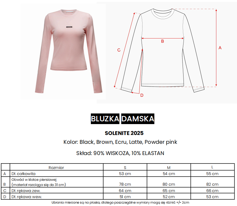 Idealnie przylegająca bluzka z długim rękawem. Wykonana z elastycznego, przyjemnego w dotyku materiału. Rękawy zakończone wycięciem na kciuk. Klasyczny, zaokrąglony dekolt. Na przodzie niewielka, elegancka, czarna metka z logo marki OLAVOGA.