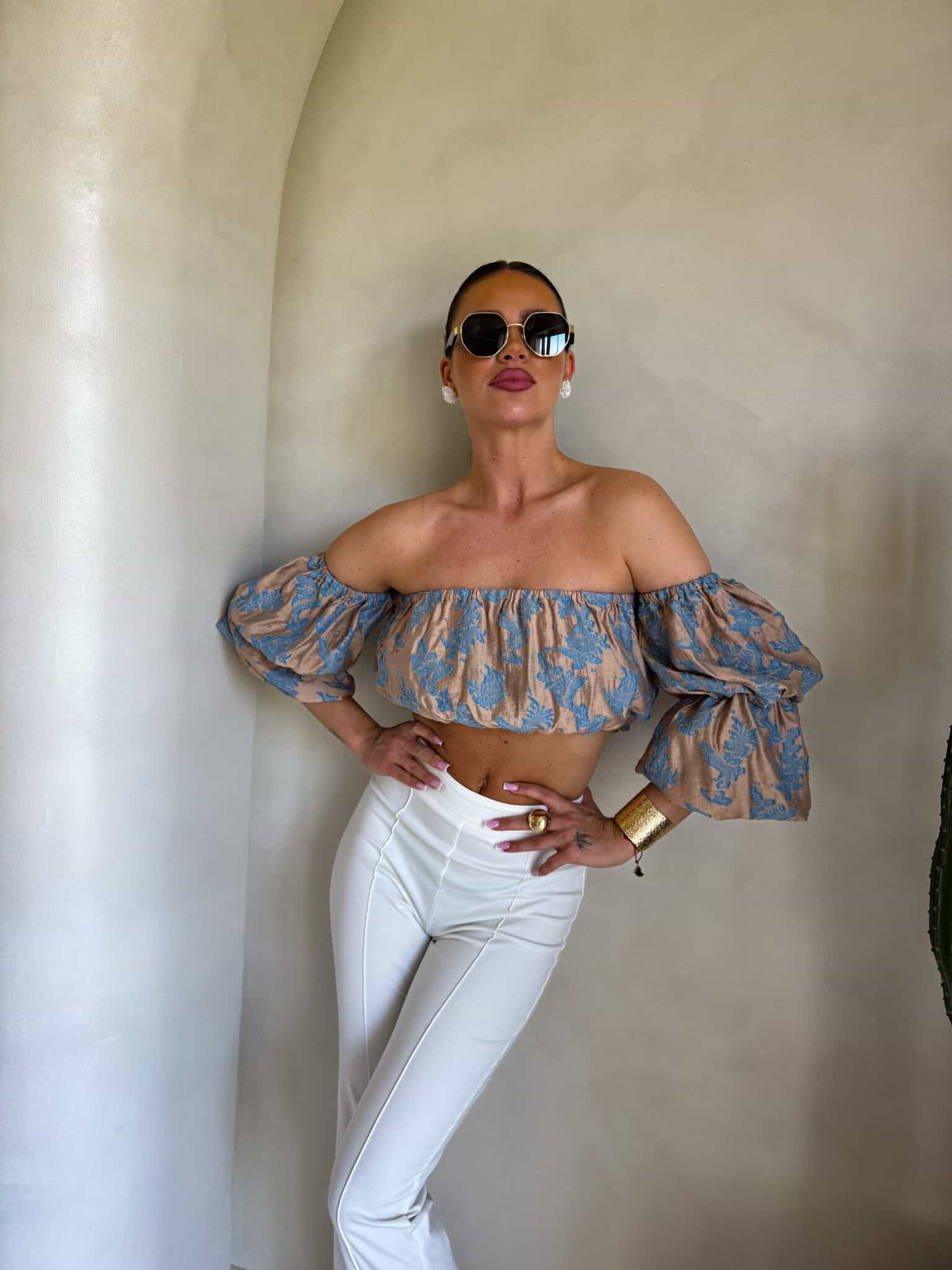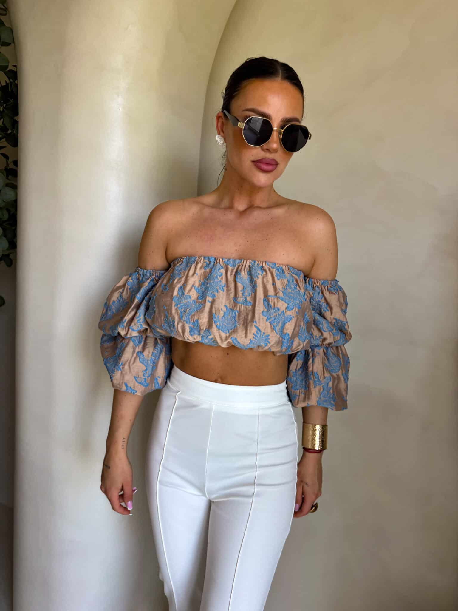 Bluzka typu hiszpanka – z odkrytymi ramionami i elastycznym wykończeniem przy dekolcie. Rękawy są długie, lekko bufiaste, zakończone gumeczką.