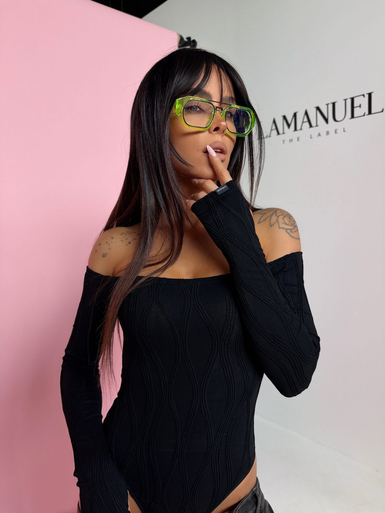 Body o dopasowanym kroju, wykonane z elastycznego materiału z wyraźną, strukturalną fakturą. Model z odkrytymi ramionami i długim rękawem, który podkreśla linię dekoltu i sylwetkę. Na rękawie subtelna metka dodająca charakteru. Całość tworzy kobiecą, nowoczesną formę idealną do stylizacji na co dzień i na wyjście.