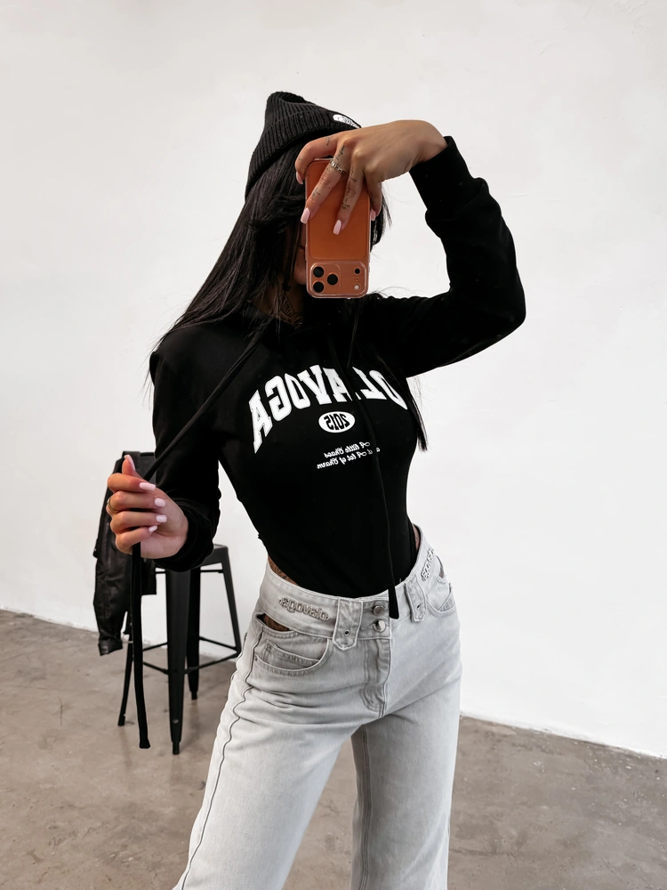 Casualowe body z długim rękawem i kapturem. Wykonane z wysokiej jakości elastycznego materiału. Prążkowane ściągacze. Przód zdobi obszerne logo marki OLAVOGA uzupełnione minimalistycznymi napisami, które przyciągają uwagę i nadają stylizacji wyrazistości.