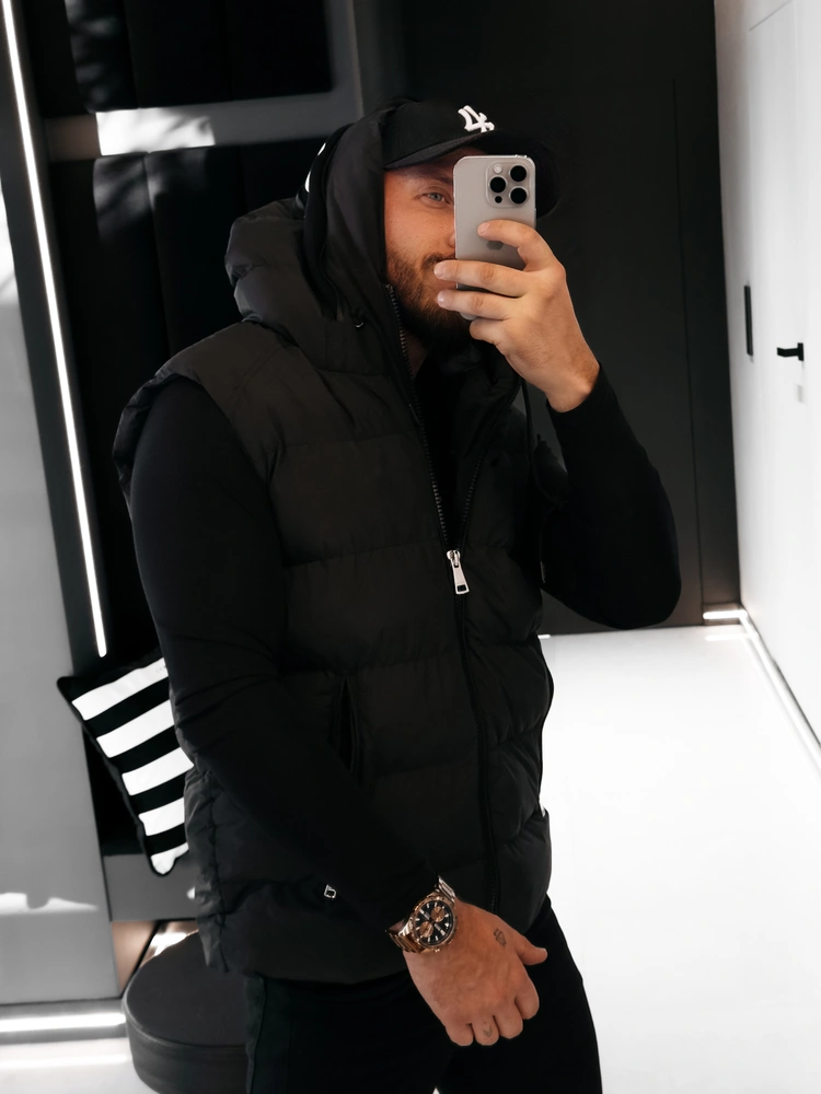 Pikowany bezrękawnik męski o nowoczesnym, casualowym charakterze. Wykonany z wysokiej jakości, gładkiej tkaniny o matowym wykończeniu, z lekkim, sprężystym wypełnieniem. Model o prostym, klasycznym kroju. Bezrękawnik zapinany na solidny zamek na całej długości. Zintegrowany kaptur z regulacją za pomocą sznurków. Na przodzie dwie praktyczne kieszenie boczne zapinane na zamki. Wewnątrz kaptura kontrastowy panel z dużym, wyrazistym logo marki OLAVOGA. Na tyle pionowa taśma z brandingiem.