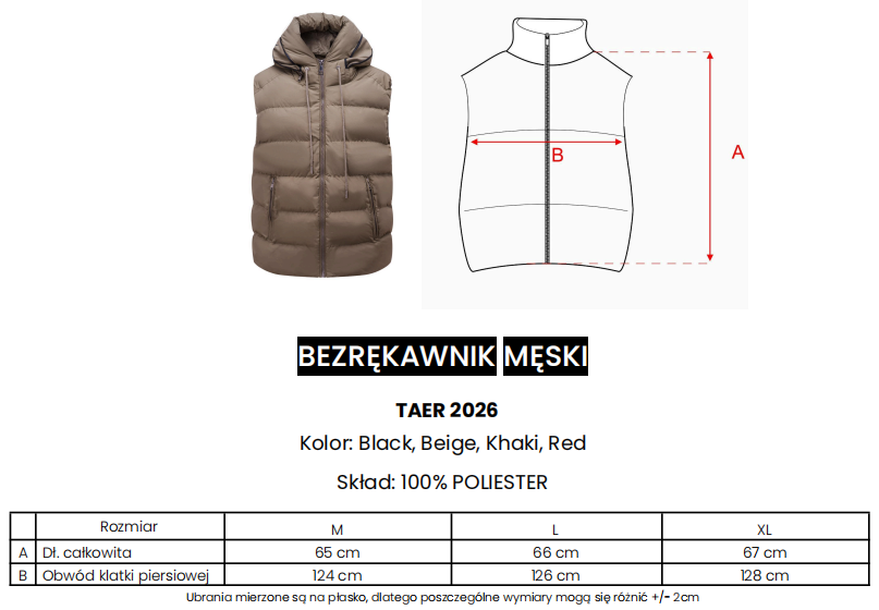 Pikowany bezrękawnik męski o nowoczesnym, casualowym charakterze. Wykonany z wysokiej jakości, gładkiej tkaniny o matowym wykończeniu, z lekkim, sprężystym wypełnieniem. Model o prostym, klasycznym kroju. Bezrękawnik zapinany na solidny zamek na całej długości. Zintegrowany kaptur z regulacją za pomocą sznurków. Na przodzie dwie praktyczne kieszenie boczne zapinane na zamki. Wewnątrz kaptura kontrastowy panel z dużym, wyrazistym logo marki OLAVOGA. Na tyle pionowa taśma z brandingiem.