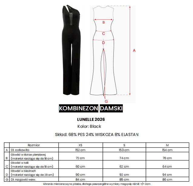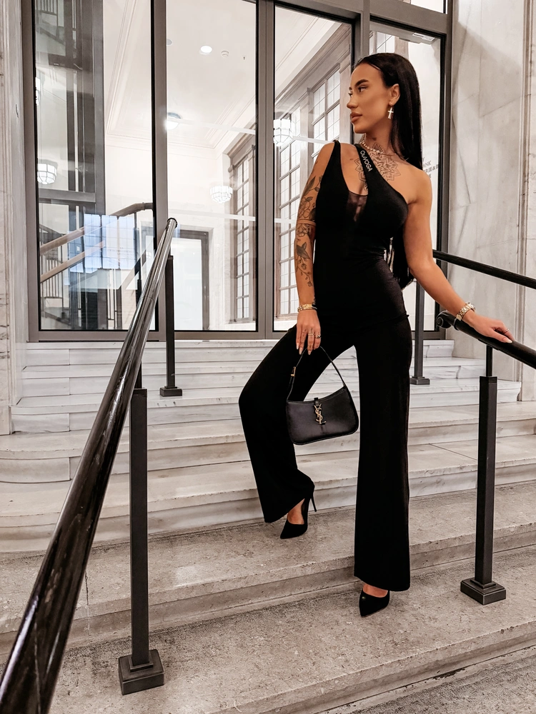 Kombinezon o dopasowanym kroju - rozszerzająca się nogawka - asymetryczny dekolt - wydłużająca elegancka linia - kontrastowy panel przy dekoldzie z siateczki - logowanie na ramiączku - elastyczna tkanina.
