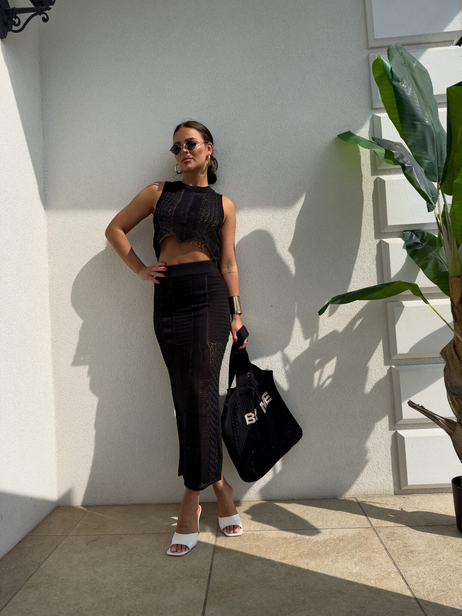 Komplet top ażurowy i spódnica z rozcięciem to idealna propozycja na letnie dni, łącząca elegancję i wygodę. Top wykonany jest z delikatnego, ażurowego materiału, który zapewnia przewiewność i lekkość. Spódnica maxi ma długość sięgającą do ziemi, z rozcięciem, które dodaje jej zmysłowości i lekkości. Gumka w pasie zapewnia wygodne dopasowanie i komfort noszenia. To doskonały wybór na wieczorne wyjścia, wakacyjne spacery czy spotkania z przyjaciółmi.