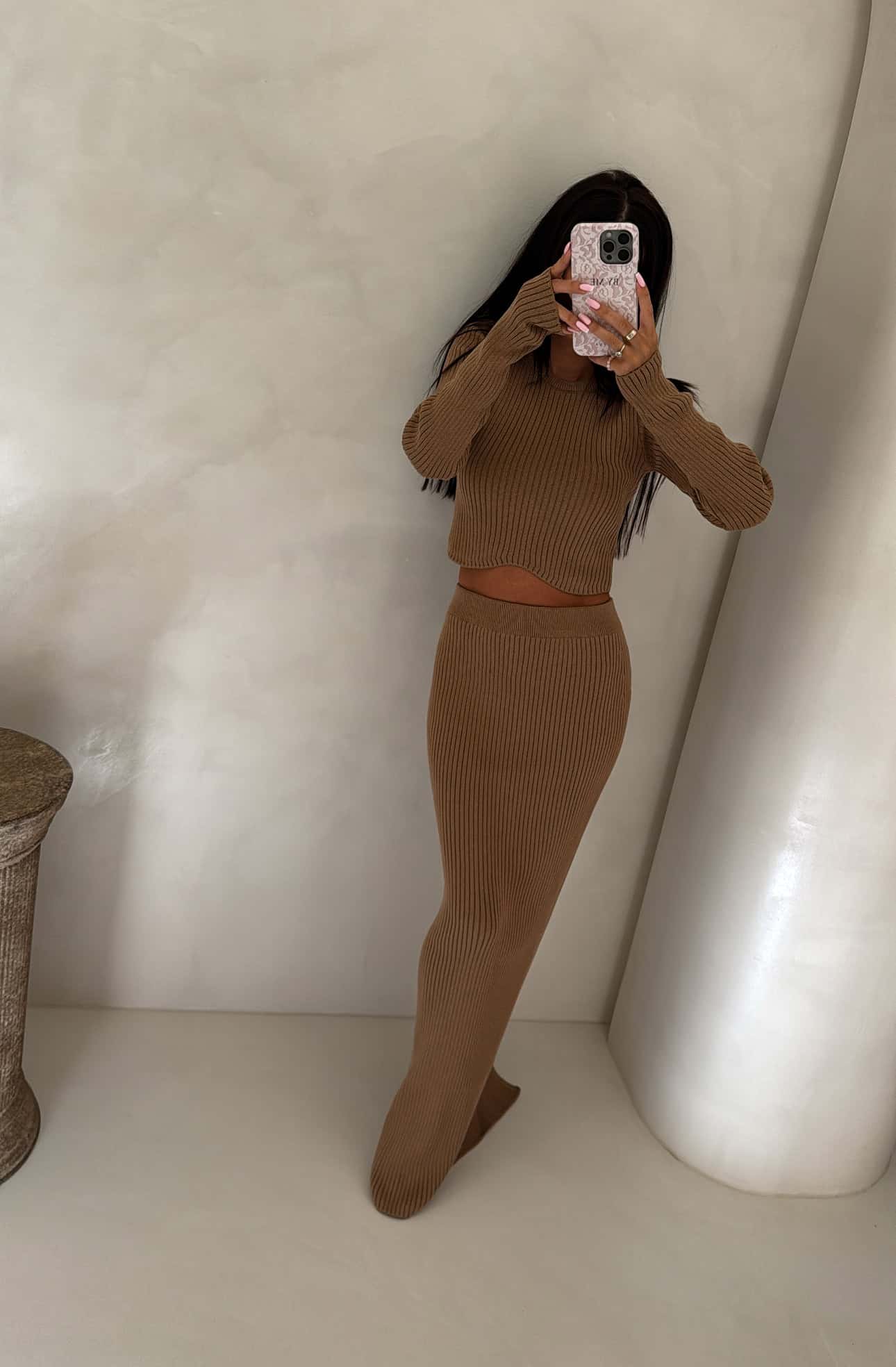 Dzianinowy komplet składający się z krótkiego, dopasowanego topu z długim rękawem oraz długiej spódnicy midi/maxi. Top z delikatnym prążkowaniem subtelnie odsłania talię i pięknie układa się na sylwetce. Spódnica z wysokim stanem, również prążkowana, jest obcisła i efektownie podkreśla kobiece kształty.