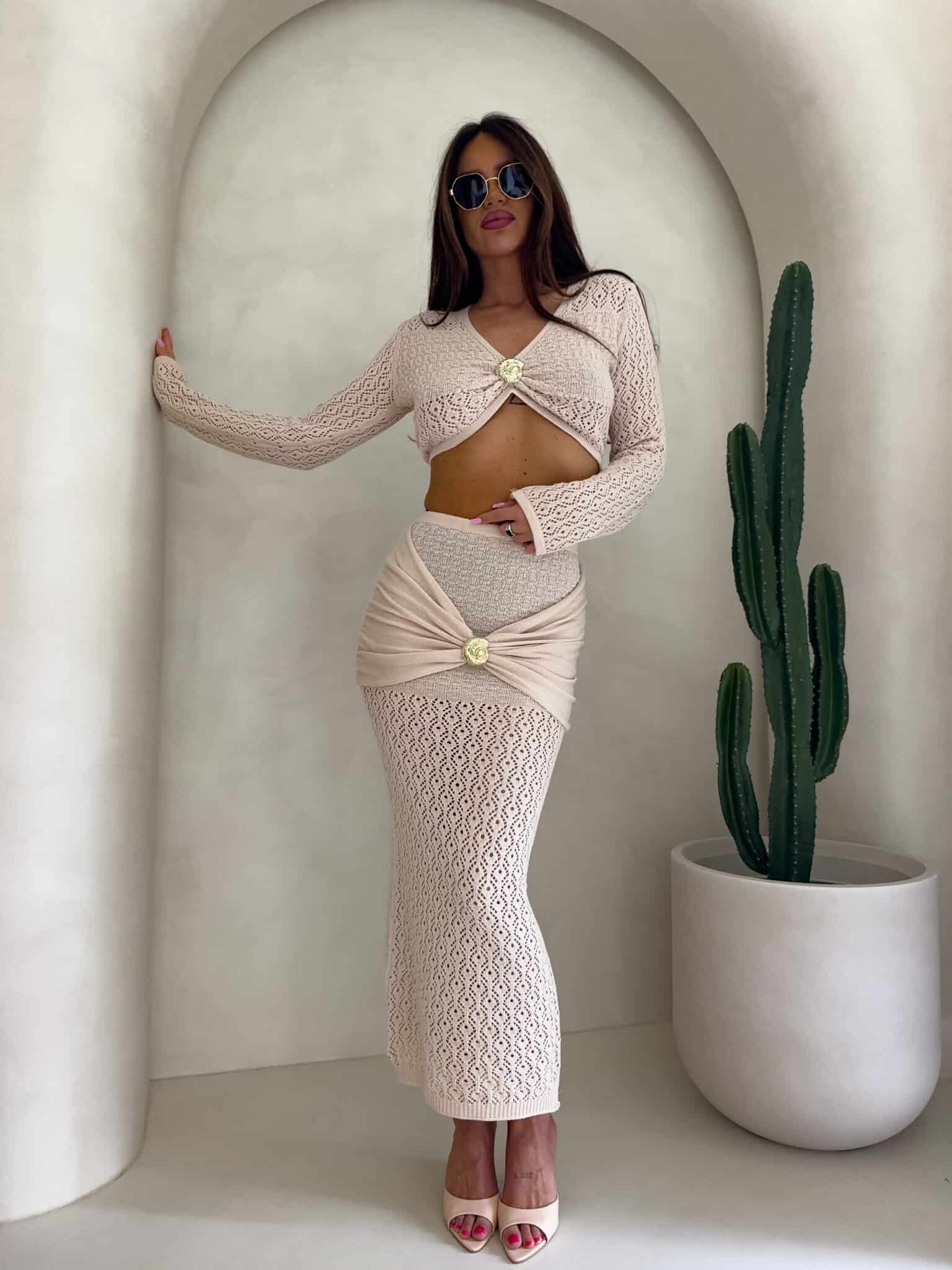 Stylowy i niezwykle kobiecy komplet wykonany z ażurowej, elastycznej dzianiny, który idealnie podkreśla sylwetkę i wpisuje się w letnie trendy. Zestaw składa się z dopasowanej spódnicy maxi oraz krótkiego topu z długim rękawem. Top o głębokim dekolcie posiada efektowne marszczenie i ozdobne zapięcie z przodu w postaci broszki, którą można odpiąć. Spódnica o długości maxi z dekoracyjnym drapowaniem w talii nadaje całości wyjątkowego charakteru.