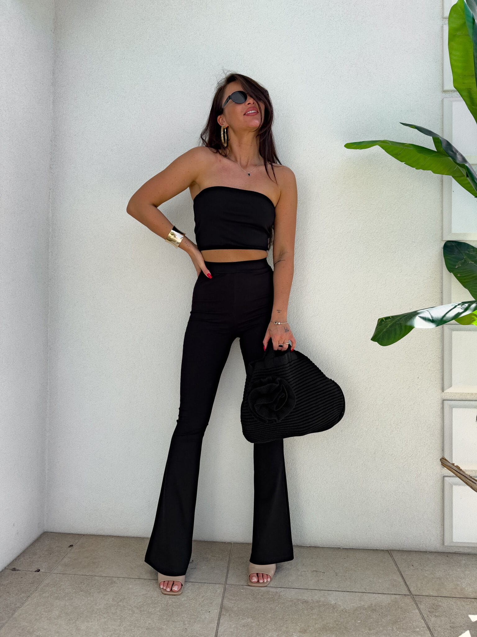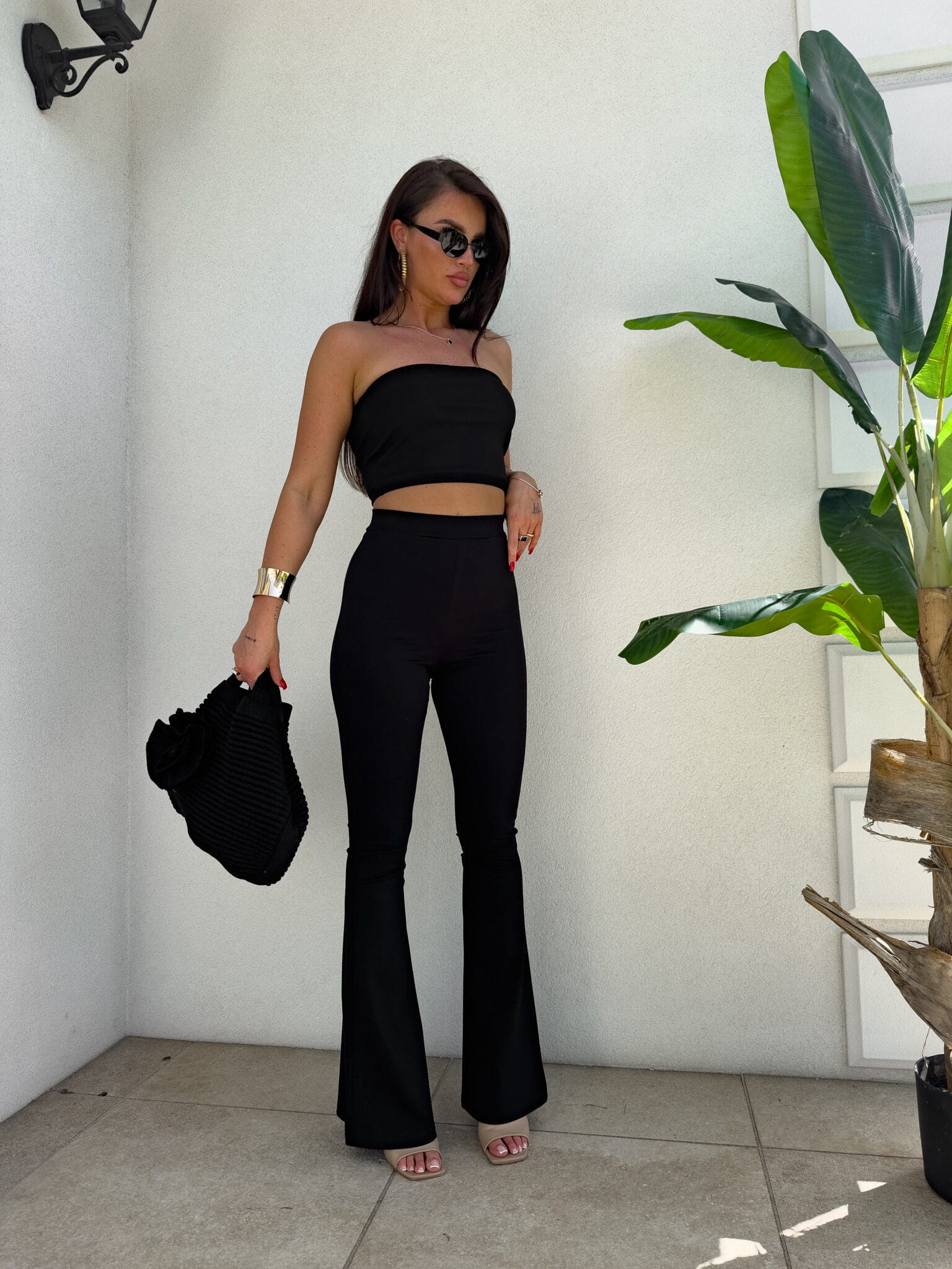 Stylowy komplet składający się z dwóch elementów – topu oraz spodni. Top w formie opaski, bez ramiączek, wykonany z elastycznego, dopasowującego się do ciała materiału, doskonale podkreśla górne partie sylwetki. Spodnie z wysokim stanem i gumką w pasie, pięknie wydłużają nogi i akcentują talię. Całość zapewnia komfort noszenia i efekt wysmuklenia sylwetki.