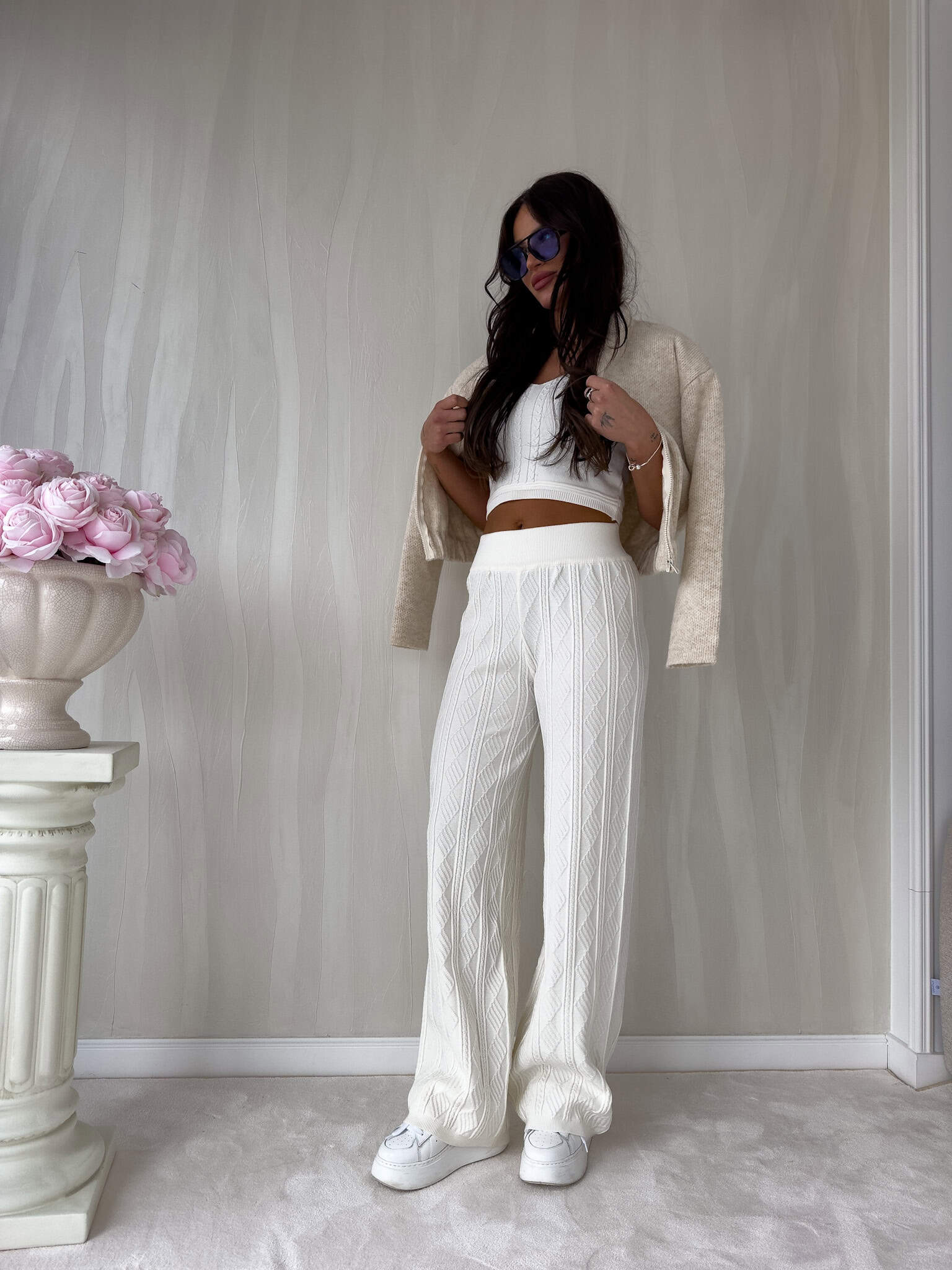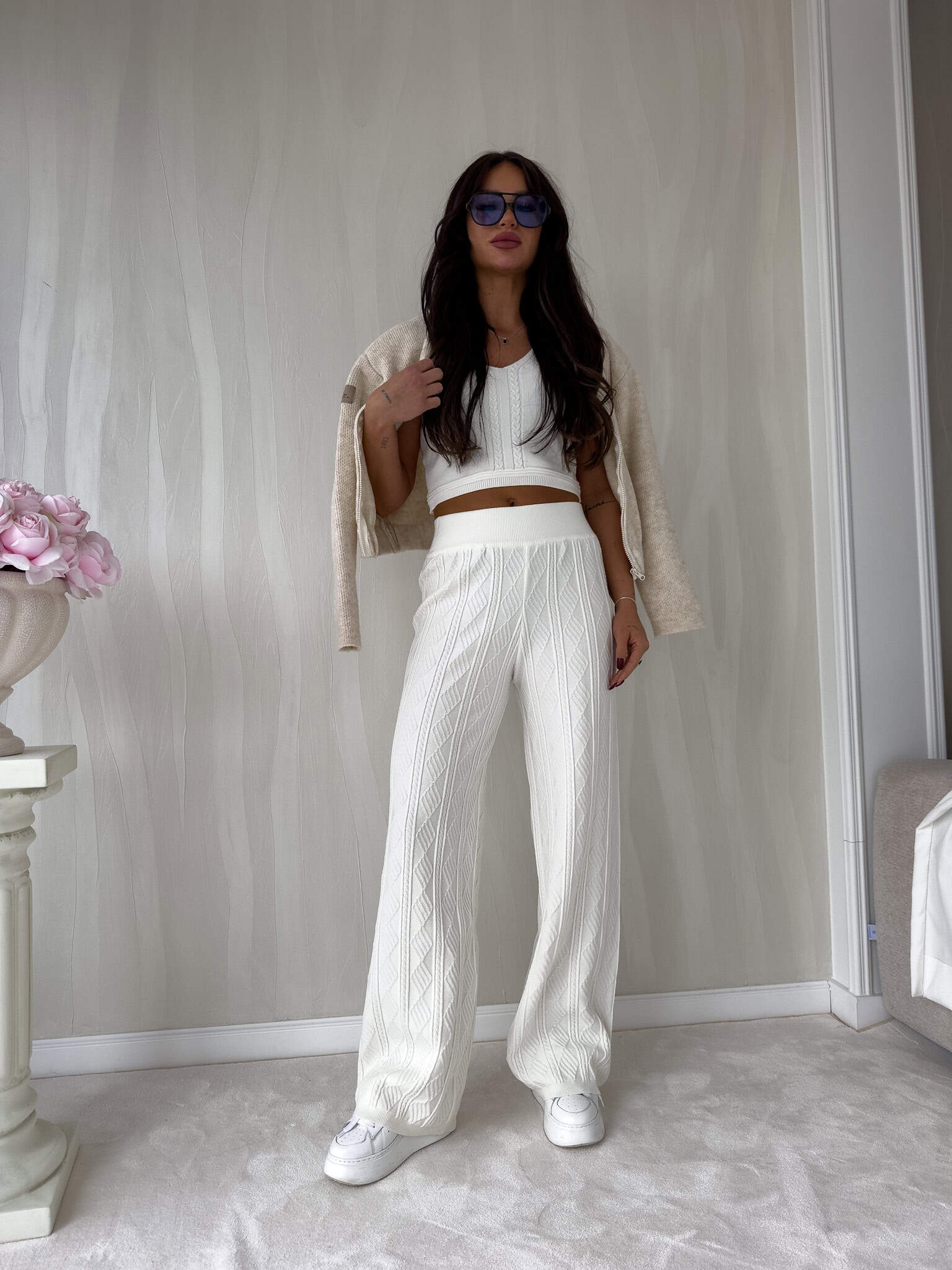 Komplet sweterkowy dzianinowy składający się z topu i spodni z szeroką nogawką. Wykonane z miękkiej dzianiny, zapewniają komfort i wygodę. Cechą wyróżniającą tego kompletu jest luźny, swobodny charakter.