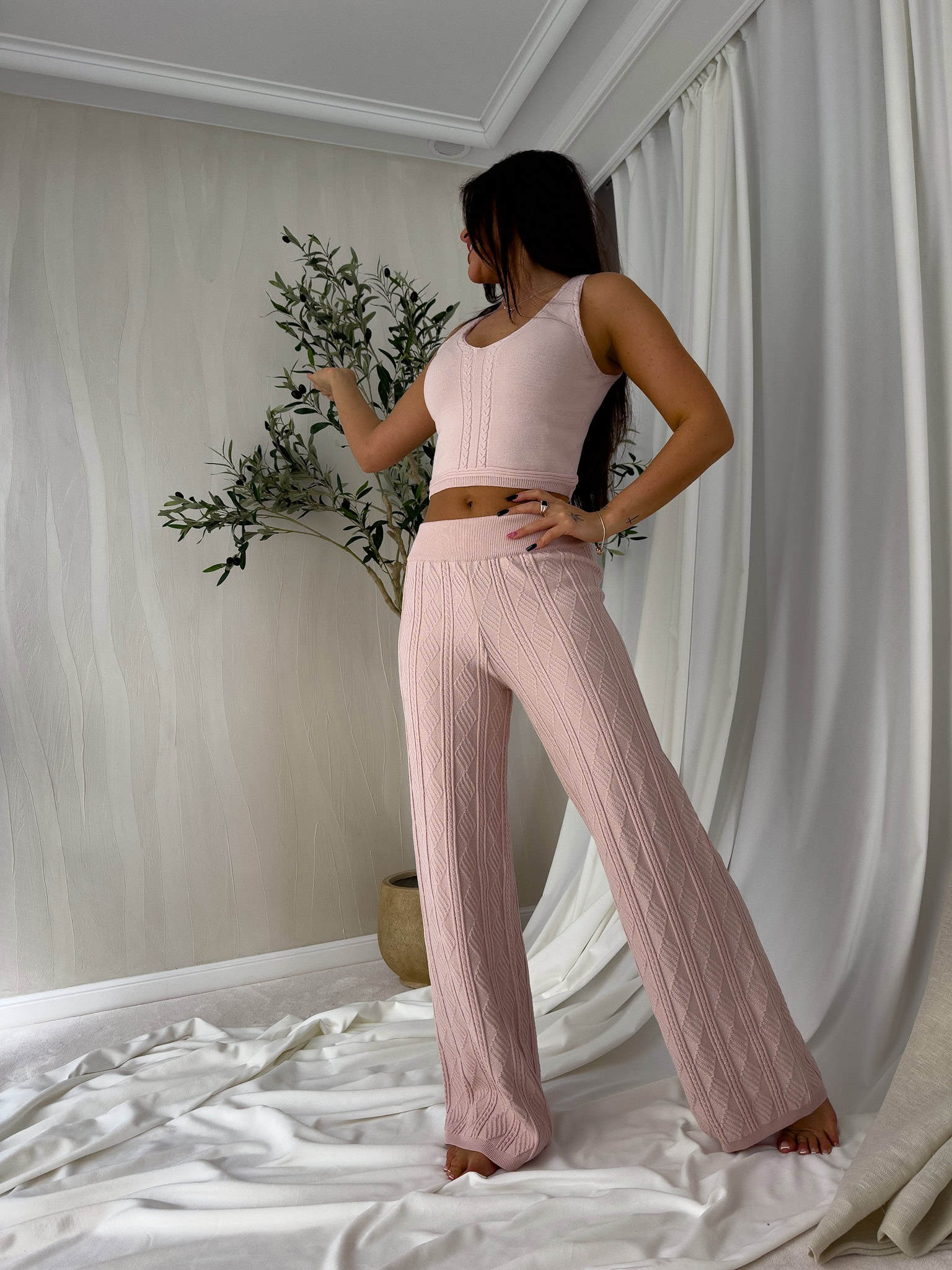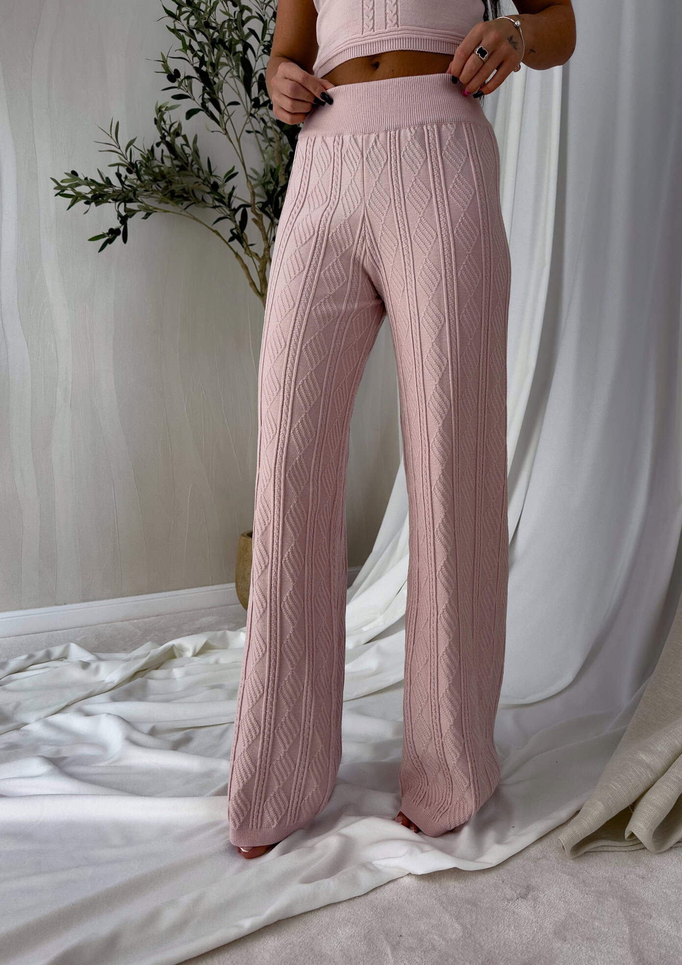 Komplet sweterkowy dzianinowy składający się z topu i spodni z szeroką nogawką. Wykonane z miękkiej dzianiny, zapewniają komfort i wygodę. Cechą wyróżniającą tego kompletu jest luźny, swobodny charakter.