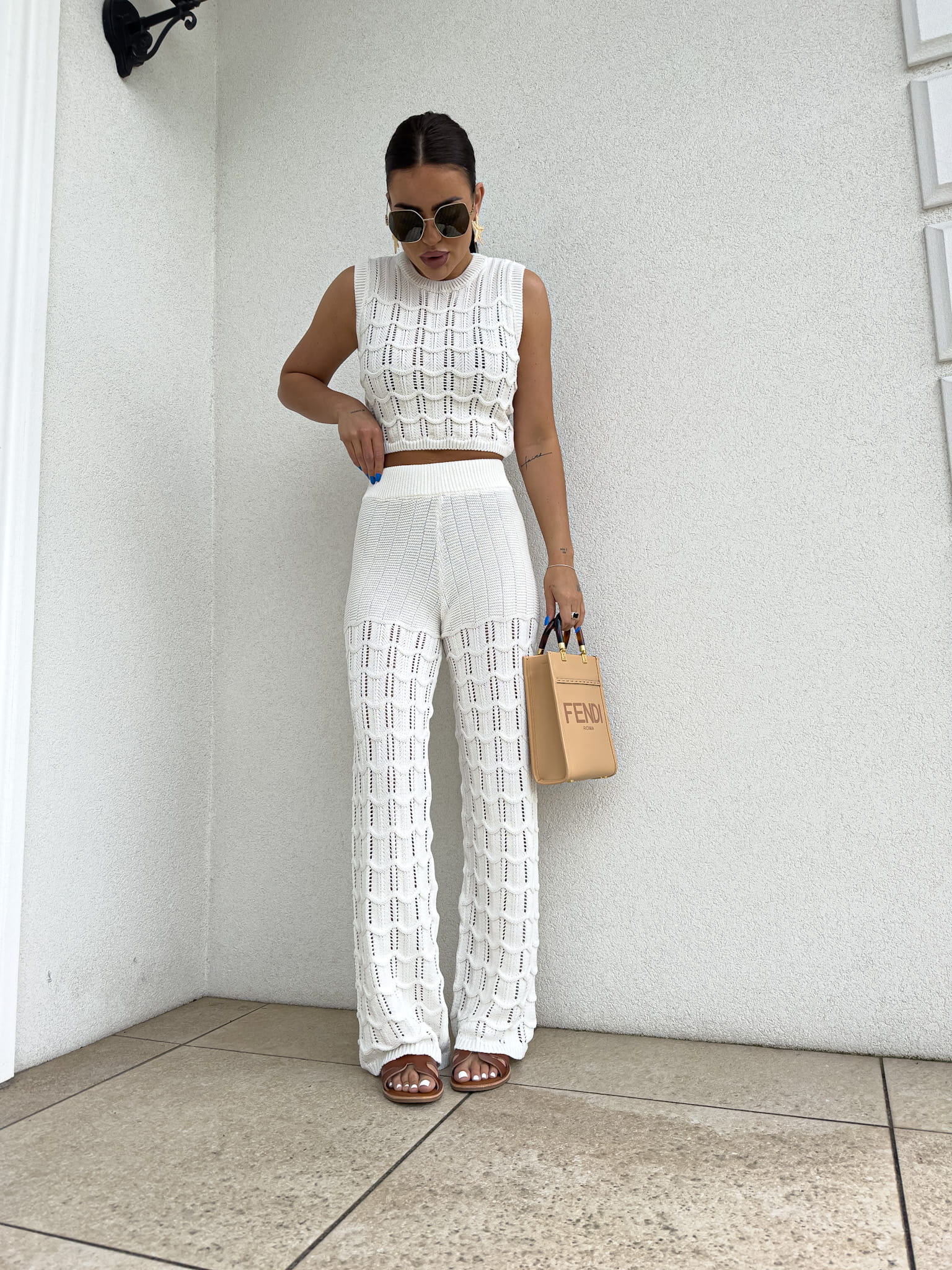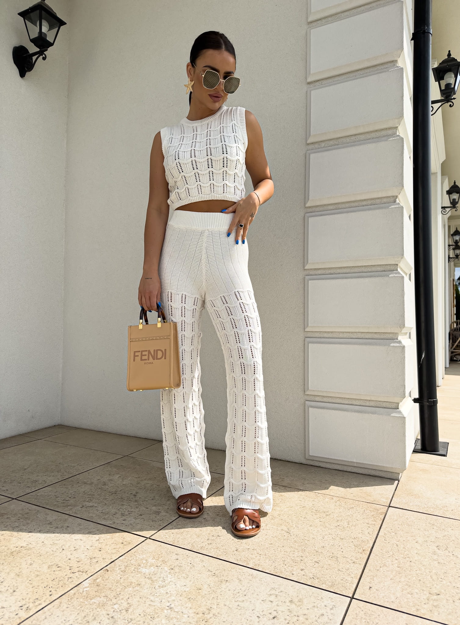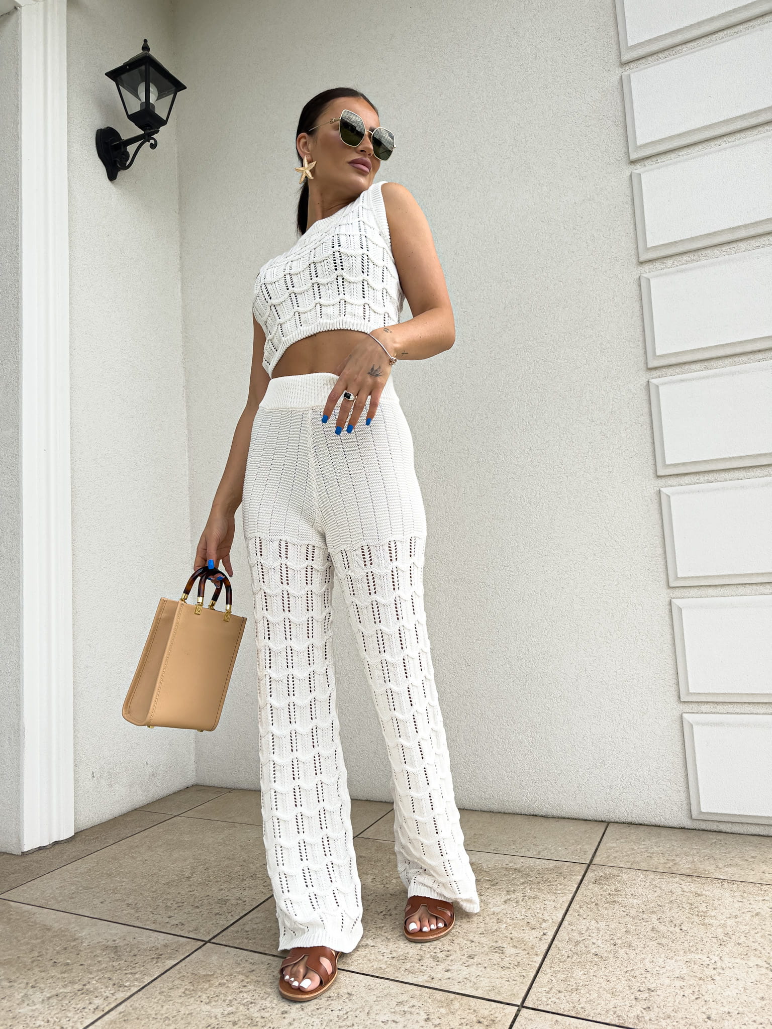 Komplet ażurowy składający się z topu i spodni z gumką w pasie to idealna propozycja na ciepłe dni, łącząca elegancję i komfort. Ażurowy wzór topu nadaje całości lekkiego i subtelnego charakteru, a miękki materiał zapewnia przewiewność i wygodę. Spodnie z gumką w pasie dopasowują się do sylwetki, gwarantując wygodę i swobodę ruchów. Taki komplet świetnie sprawdzi się na wakacyjne wyjazdy, letnie spotkania czy codzienne stylizacje w ciepłych miesiącach. Idealny do połączenia z sandałami, espadrylami czy delikatnymi akcesoriami, tworząc modny, a zarazem komfortowy look.
