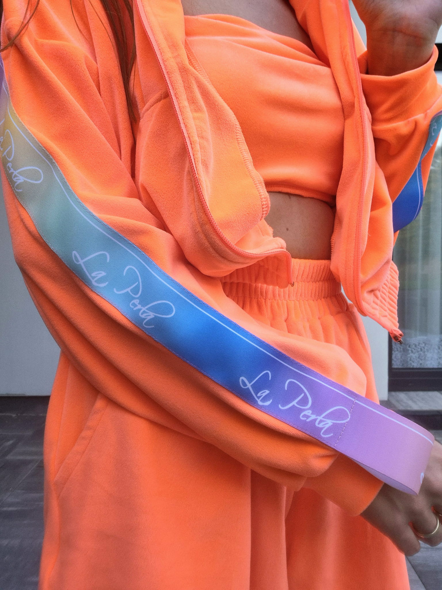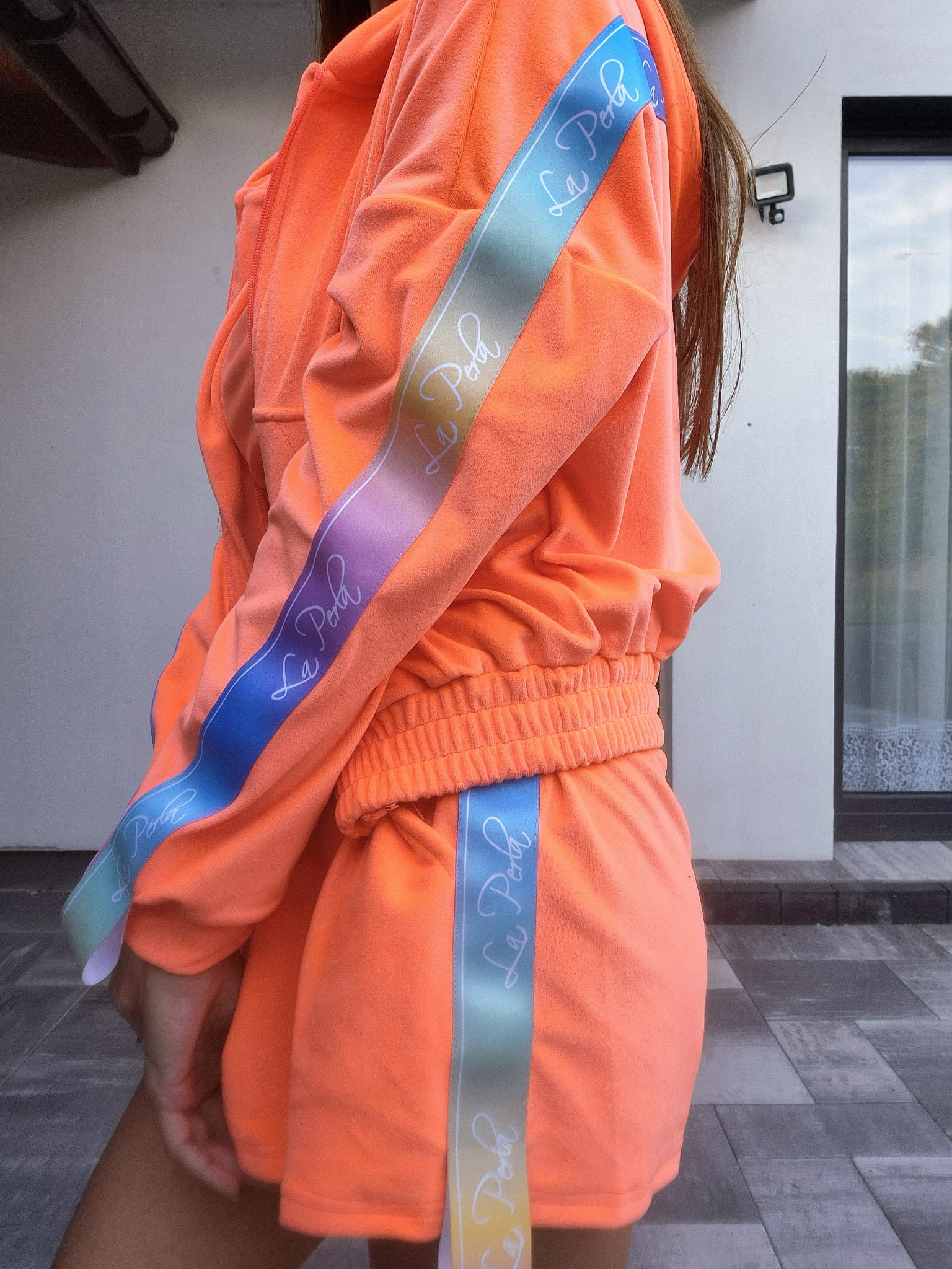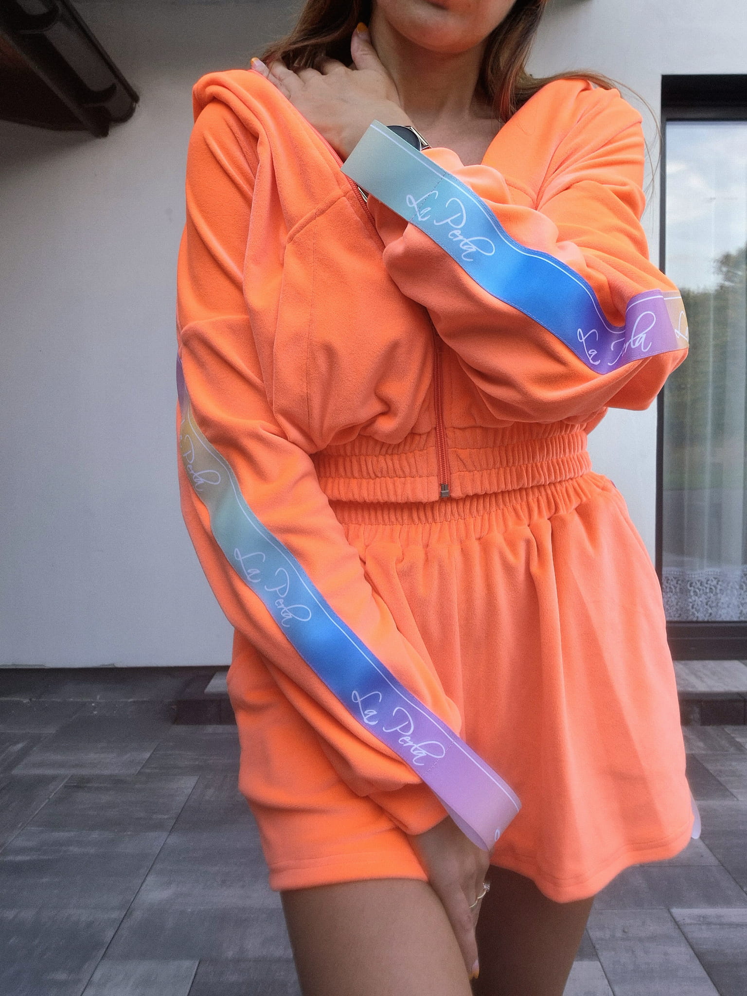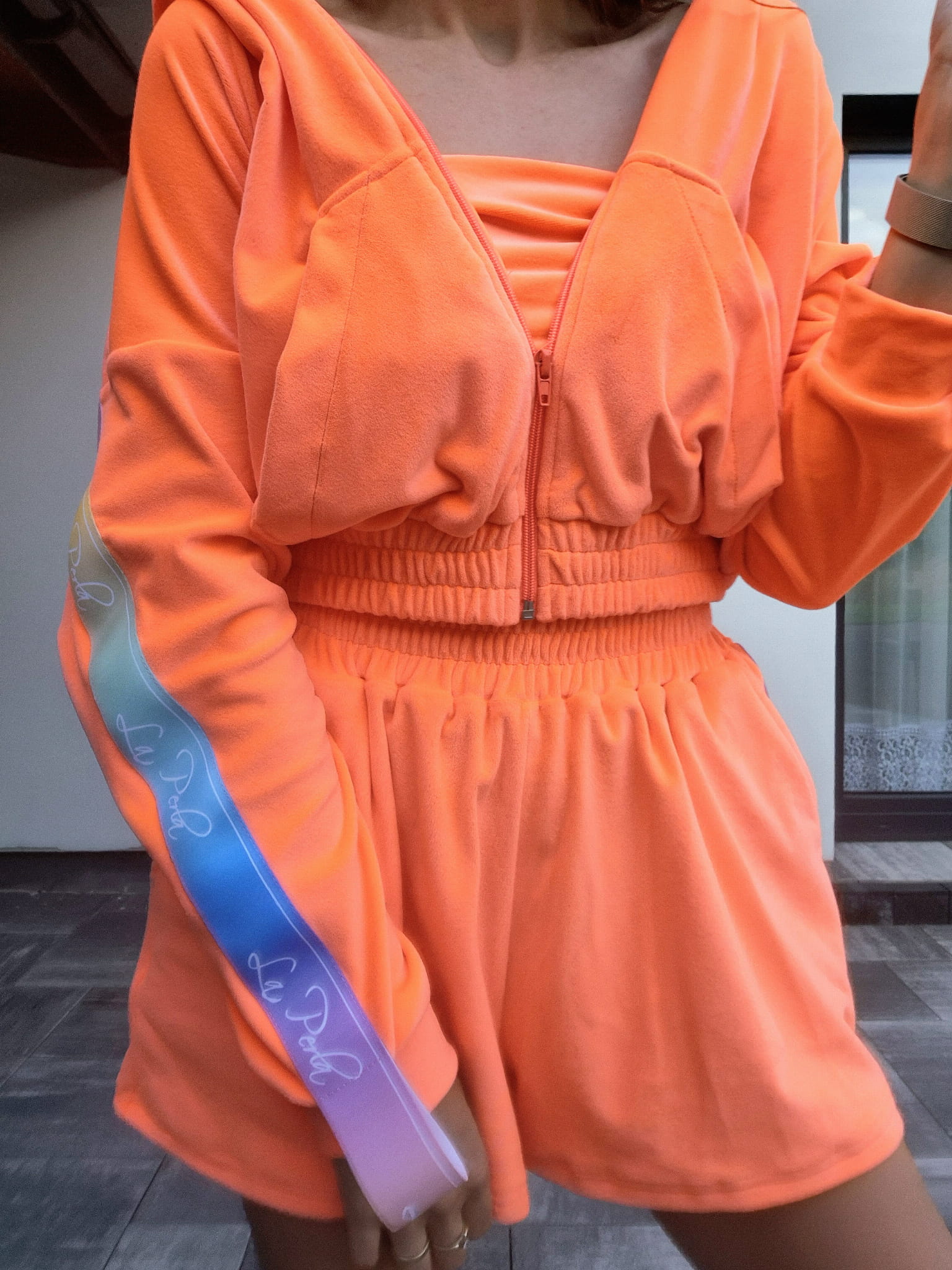 KOMPLET DAMSKI LA PERLA KRÓTKIE SPODENKI BLUZA TOP WELUR POMARAŃCZOWY NEON