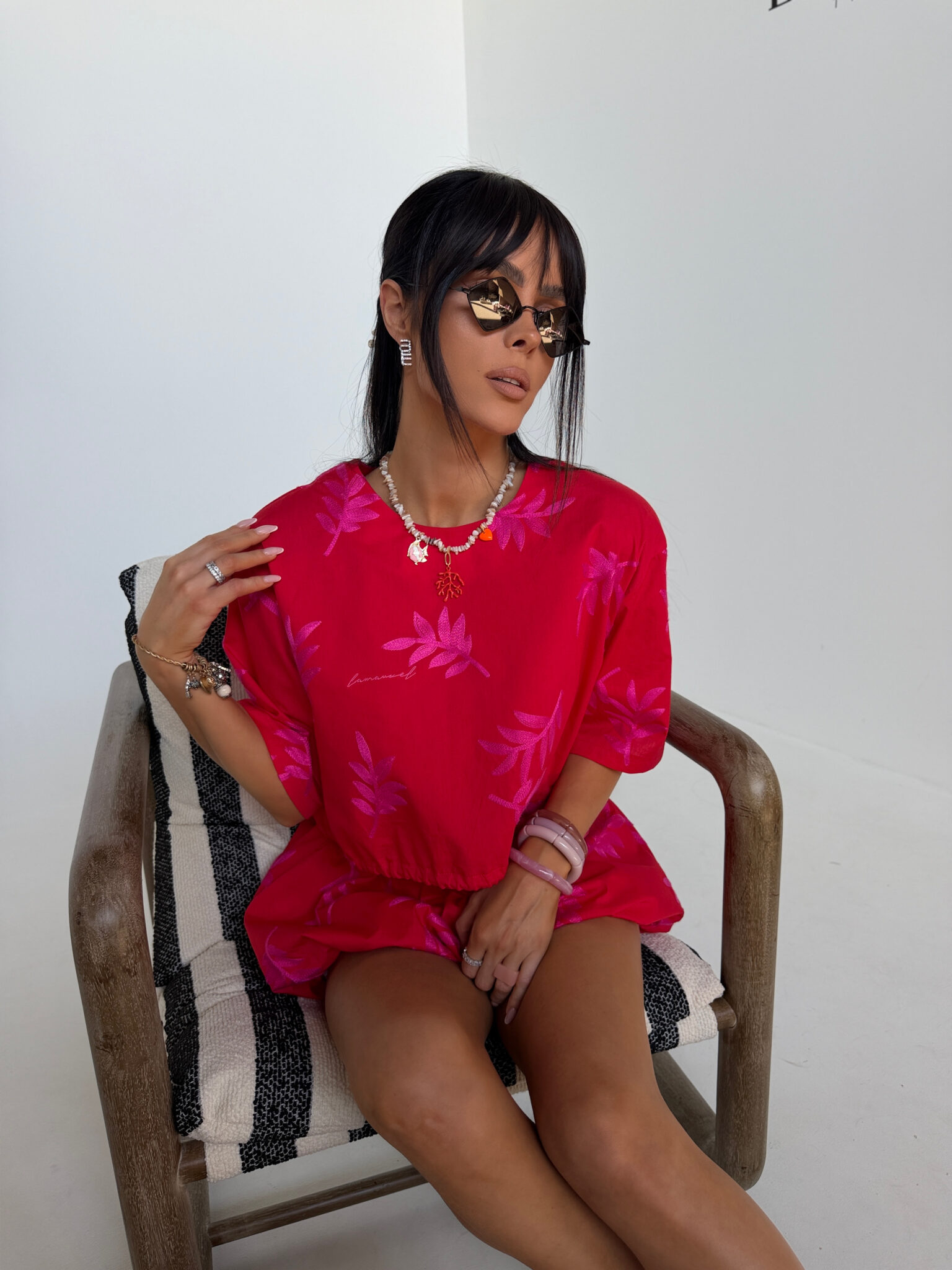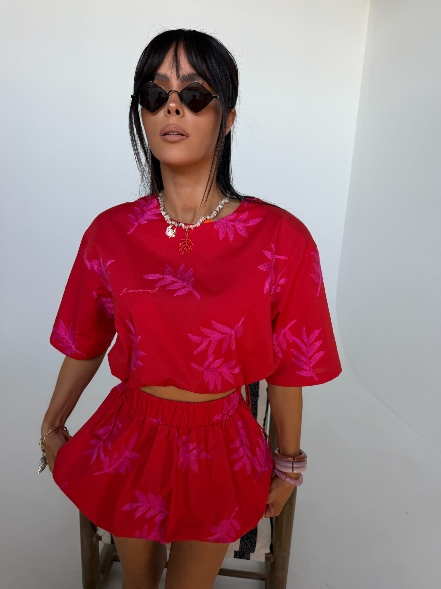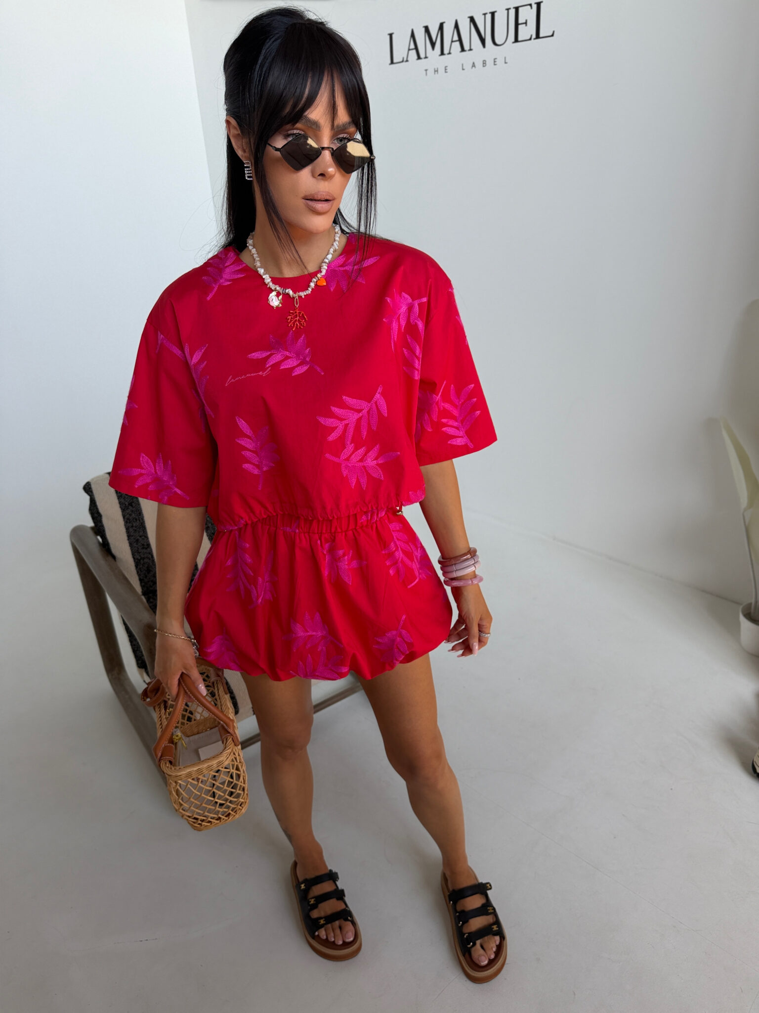 Kolor, który robi efekt od pierwszego spojrzenia. Intensywny odcień w połączeniu z subtelnym, roślinnym wzorem nadaje całości wyrazistego, letniego charakteru. Luźniejsza góra daje swobodę noszenia, a dzięki regulacji gumkami można ją dopasować do sylwetki, podkreślając talię i tworząc bardziej zarysowaną formę. Spódniczka typu bombka dodaje objętości i lekkości, pięknie pracując w ruchu i eksponując nogi. Całość tworzy energetyczny, kobiecy look, który przyciąga uwagę i idealnie wpisuje się w wakacyjny klimat.