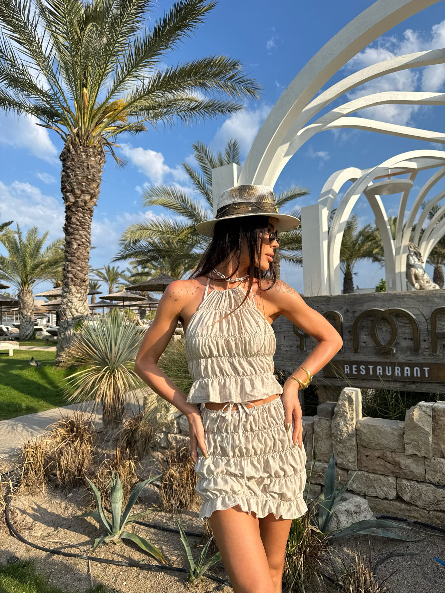 Komplet z delikatnej, bawełnianej tkaniny w paski składający się z wiązanego na szyi topu oraz mini spódniczki, całość uszyta z elastycznych paneli na gumonici które efektownie marszczą materiał i dopasowują się do sylwetki. Produkt mocno uciągliwy!