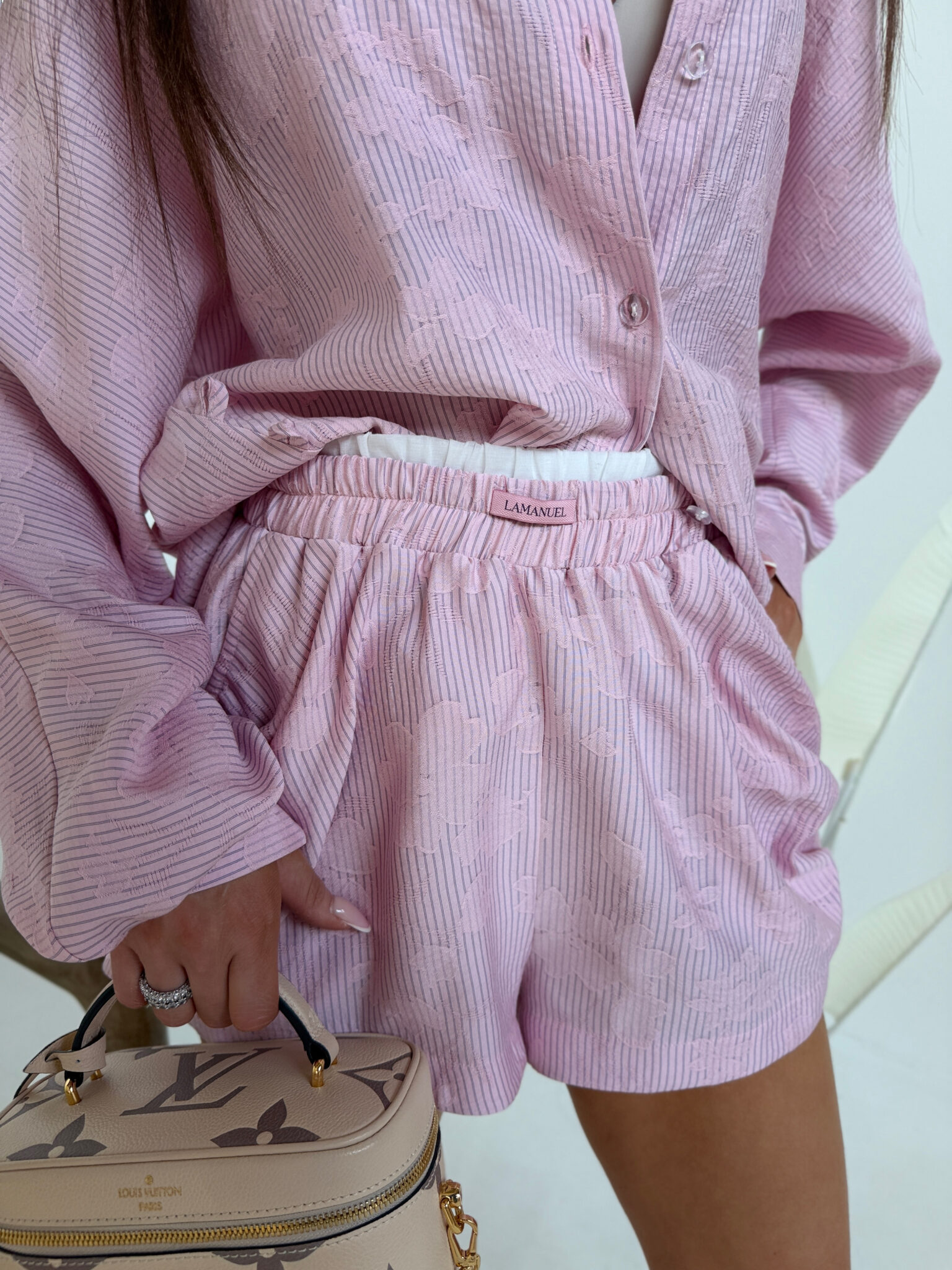 Swobodna forma z dopracowanym detalem, który zmienia charakter całej sylwetki. Luźniejsza, wydłużona koszula daje efekt lekkości i nonszalancji, a dzięki zapięciu na guziki po bokach można ją modelować w talii, podkreślając proporcje i nadając bardziej kobiecej linii. Delikatna struktura materiału dodaje głębi i subtelnej elegancji, zachowując przy tym codzienny komfort. Szorty z podwójną gumą w pasie idealnie dopasowują się do sylwetki, zapewniając wygodę i stabilne ułożenie. Całość tworzy nowoczesny, lekko wakacyjny look, który łączy luz z wyrafinowanym wykończeniem.