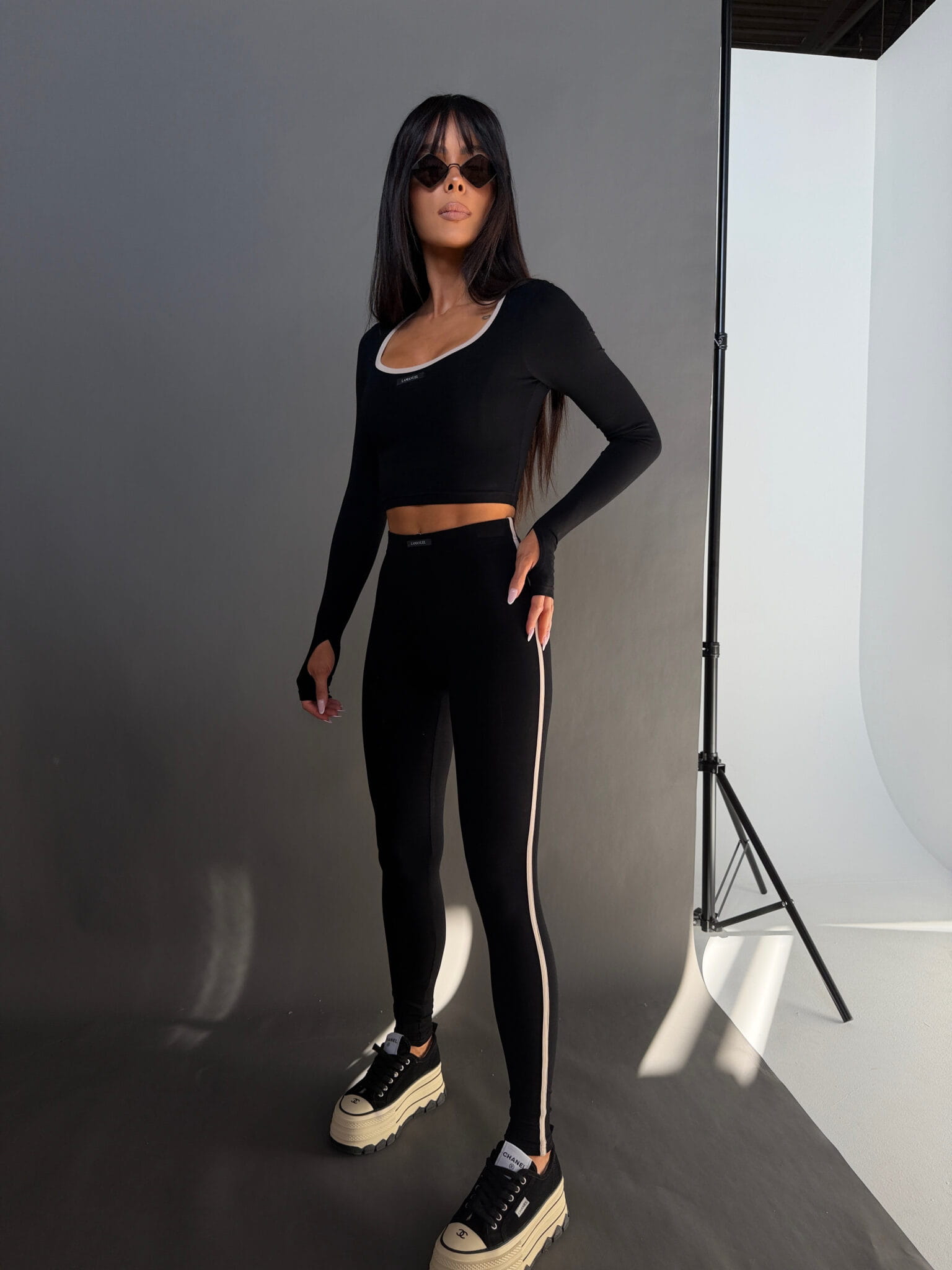 Dopasowany komplet wykonany z elastycznej, miękkiej wiskozy, która przyjemnie otula sylwetkę i zapewnia wysoki komfort noszenia. Top o skróconym kroju podkreśla talię i eksponuje linię ramion, a legginsy z wysokim stanem modelują figurę i dobrze dopasowują się do ciała. Kontrastowe lamówki nadają całości sportowej lekkości i nowoczesnego charakteru. Zestaw idealnie sprawdza się w codziennych stylizacjach, podróży oraz wygodnych miejskich outfitach.