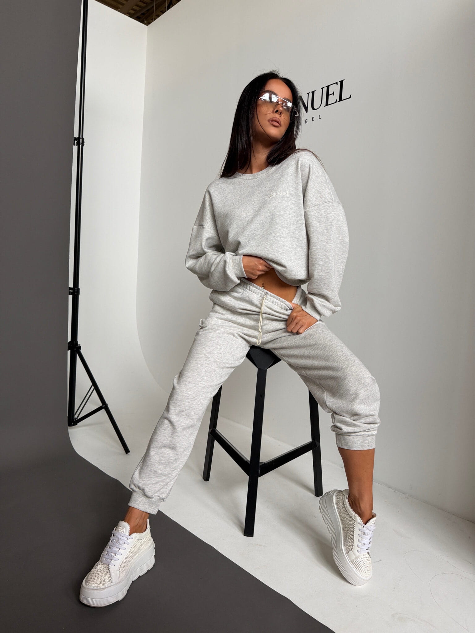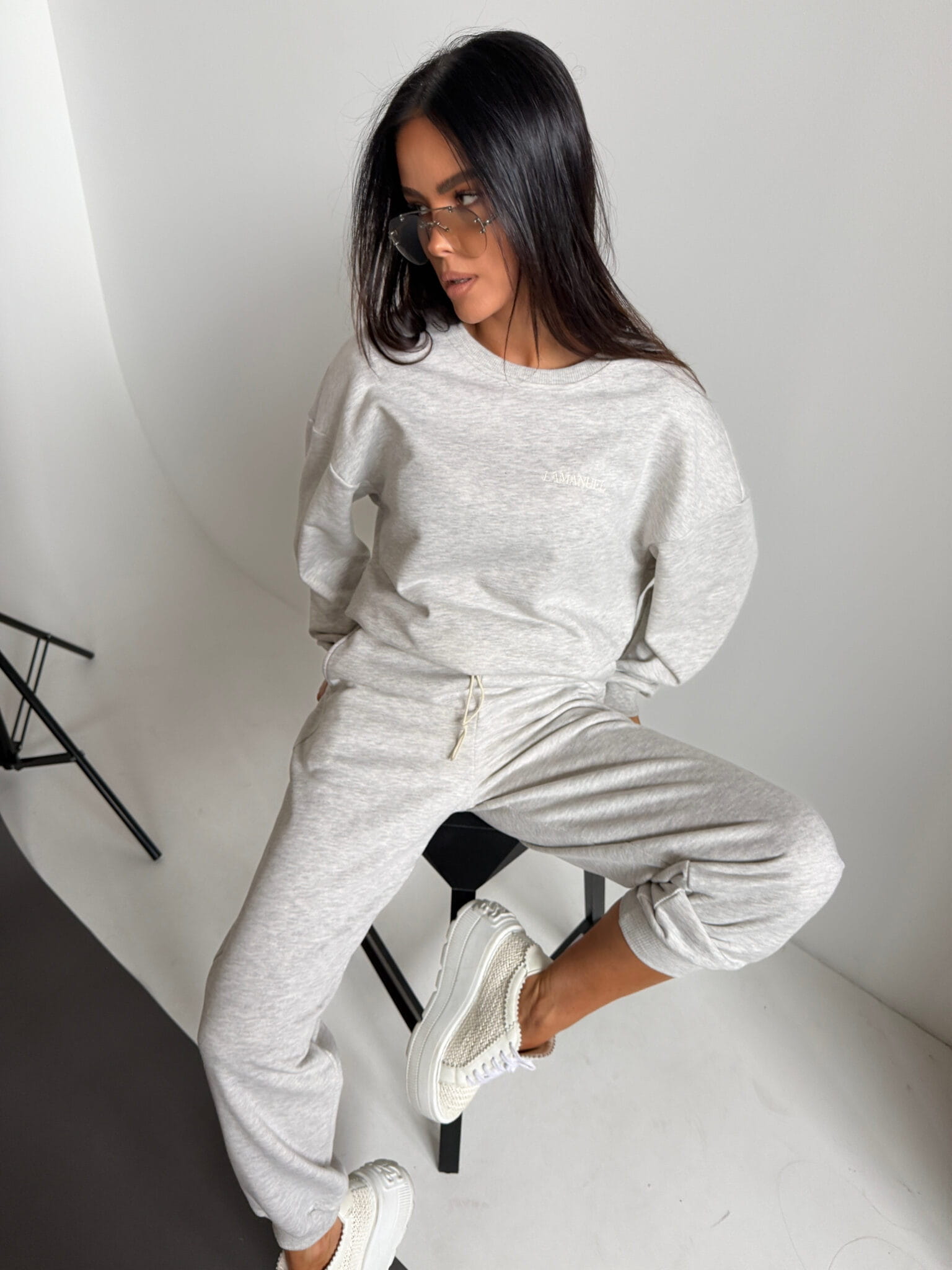 Swobodny komplet, który dobrze układa się na sylwetce bez efektu „przerysowania”. Bluza ma luźniejszą formę, dzięki czemu wygląda lekko i nowocześnie. Spodnie z elastycznym pasem i regulacją pozwalają dopasować je w talii, a ściągacze przy nogawkach nadają całości bardziej dopracowany kształt.