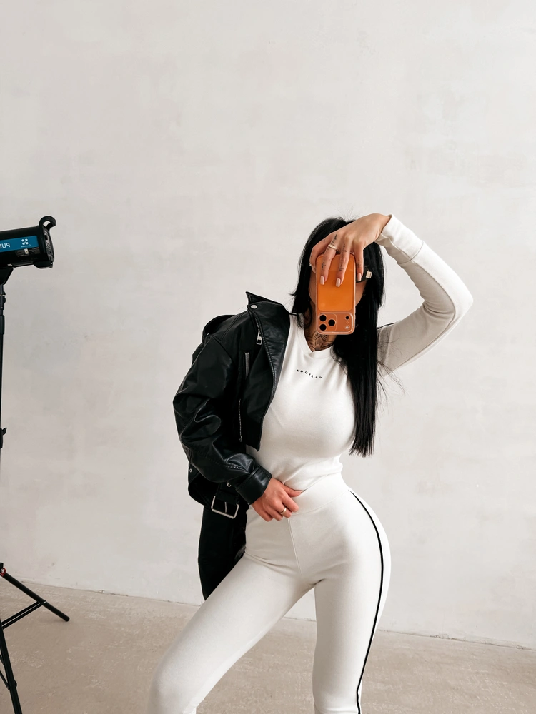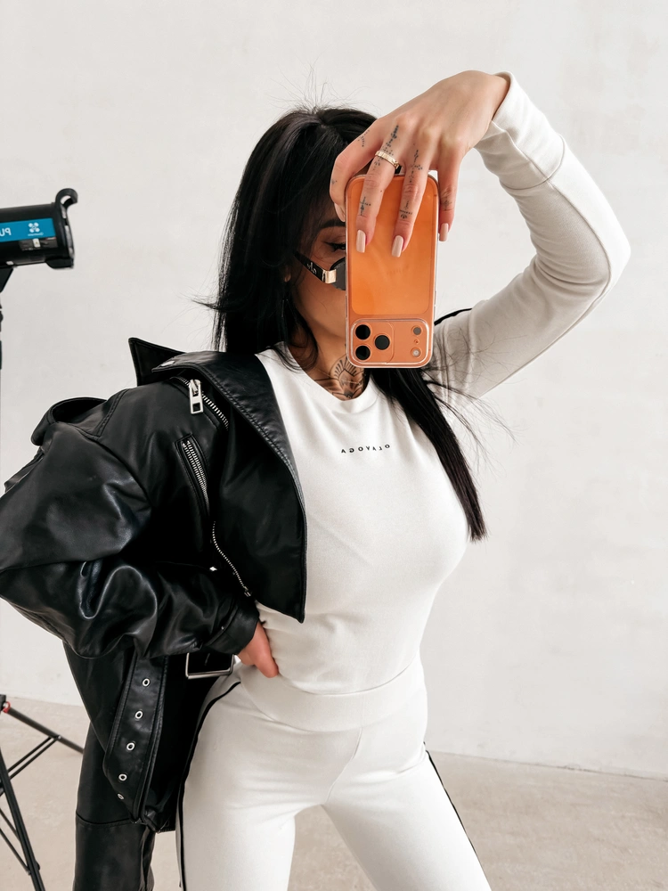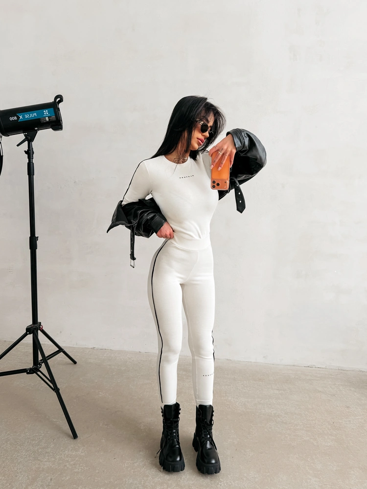Casualowy komplet wykonany z miękkiej, elastycznej dzianiny o wyraźnej, subtelnej strukturze. Góra – dopasowany longsleeve o klasycznym kroju, podkreślającym sylwetkę. Model z długim rękawem, wykończonym delikatnymi mankietami. Na brzegach kontrastowe lampasy. Na przodzie subtelne, minimalistyczne logo marki OLAVOGA. Dół – legginsy z wysokim stanem. Model o wąskich nogawkach, zakończonych elastycznym wykończeniem. Na nogawce umieszczone delikatne logo OLAVOGA, spójne stylistycznie z górą.