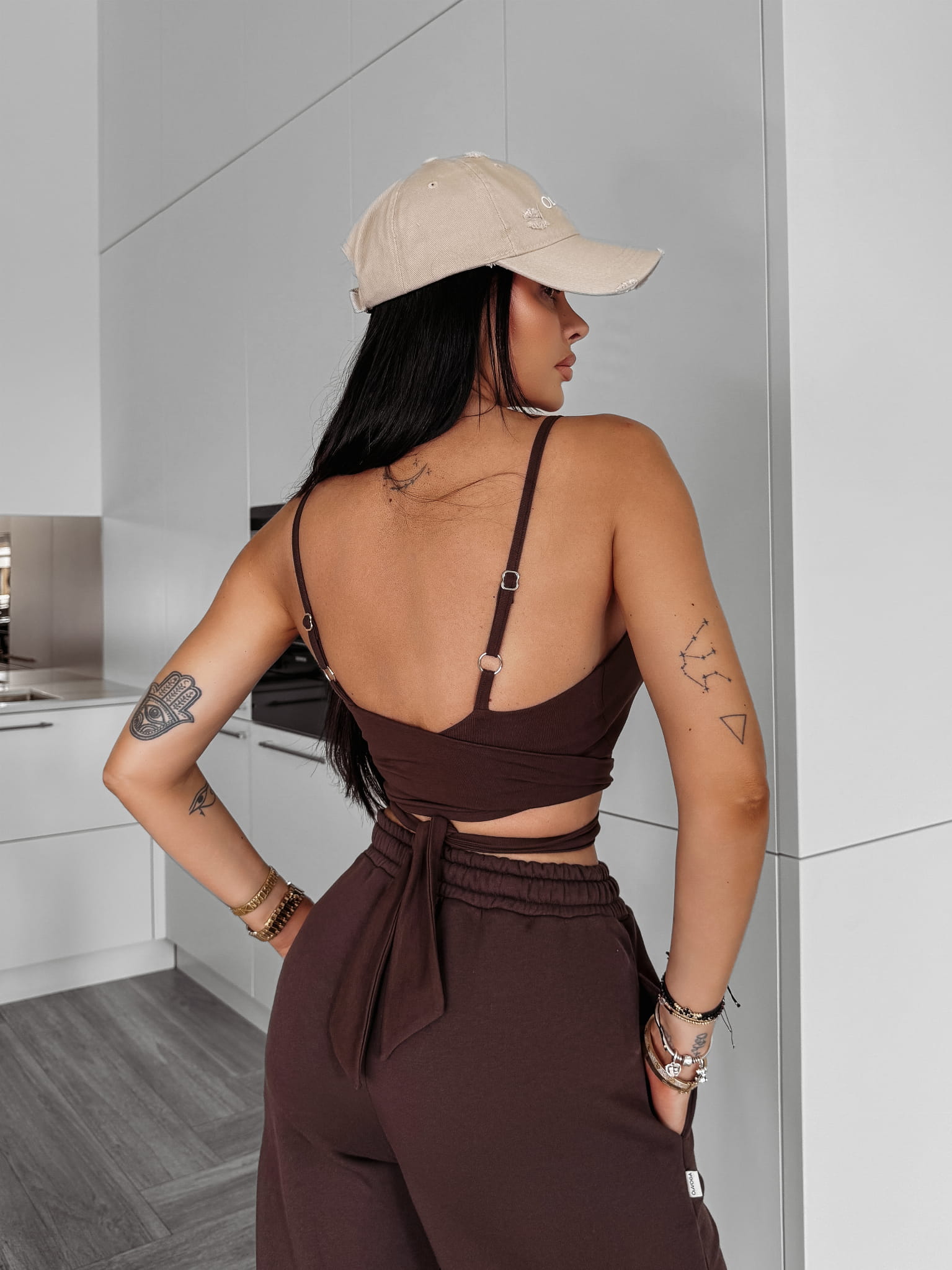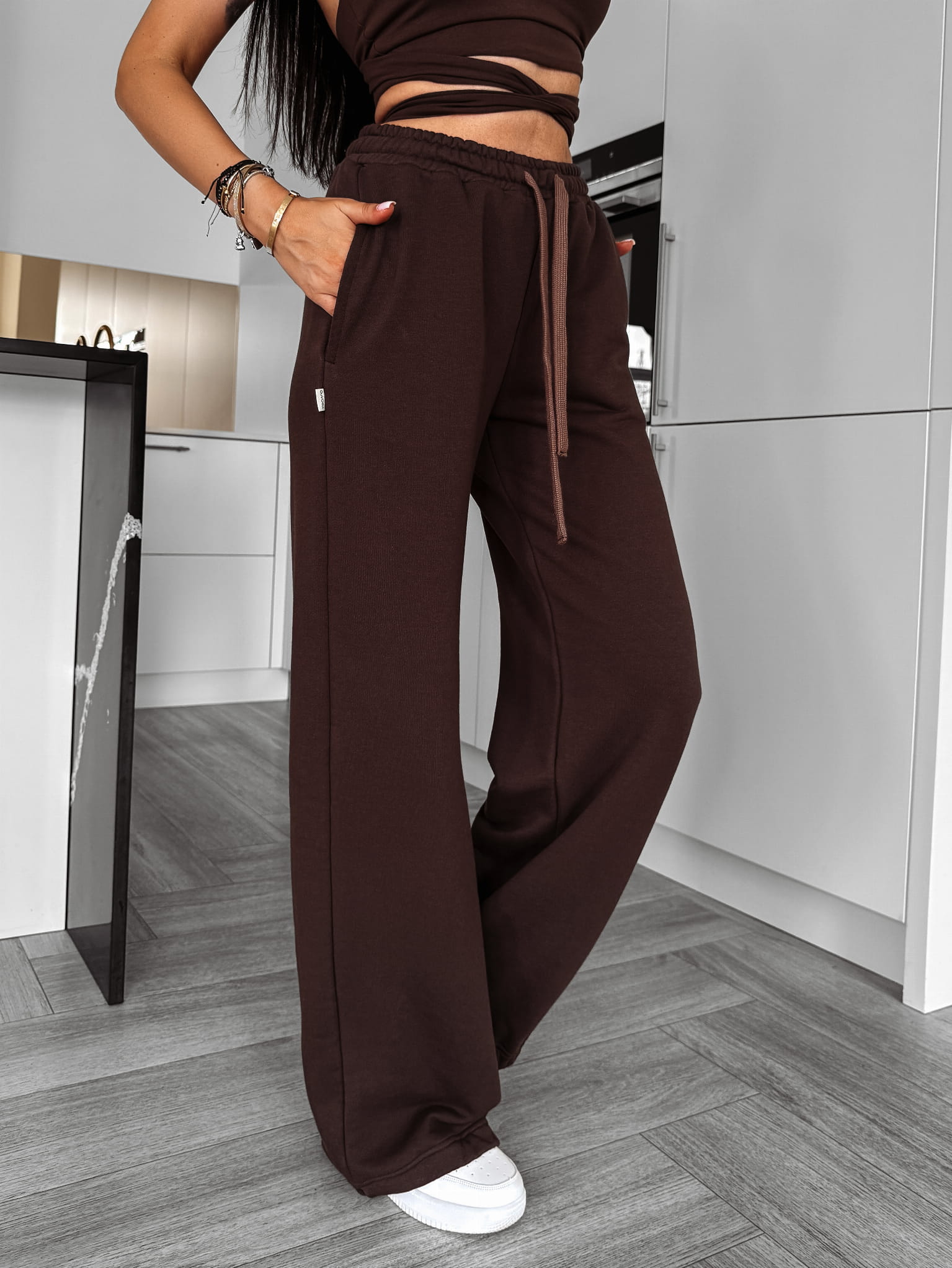 Komplet damski wykonany z wysokiej jakości materiału bawełnianego. Góra - top, o krótszym kroju z wiązaniem i regulowanymi ramiączkami. Dół - sportowe spodnie z wysokim stanem. Regulacja w talii oraz nogawkach. Po boku kieszenie. Po boku minimalistyczna logowana naszywka.