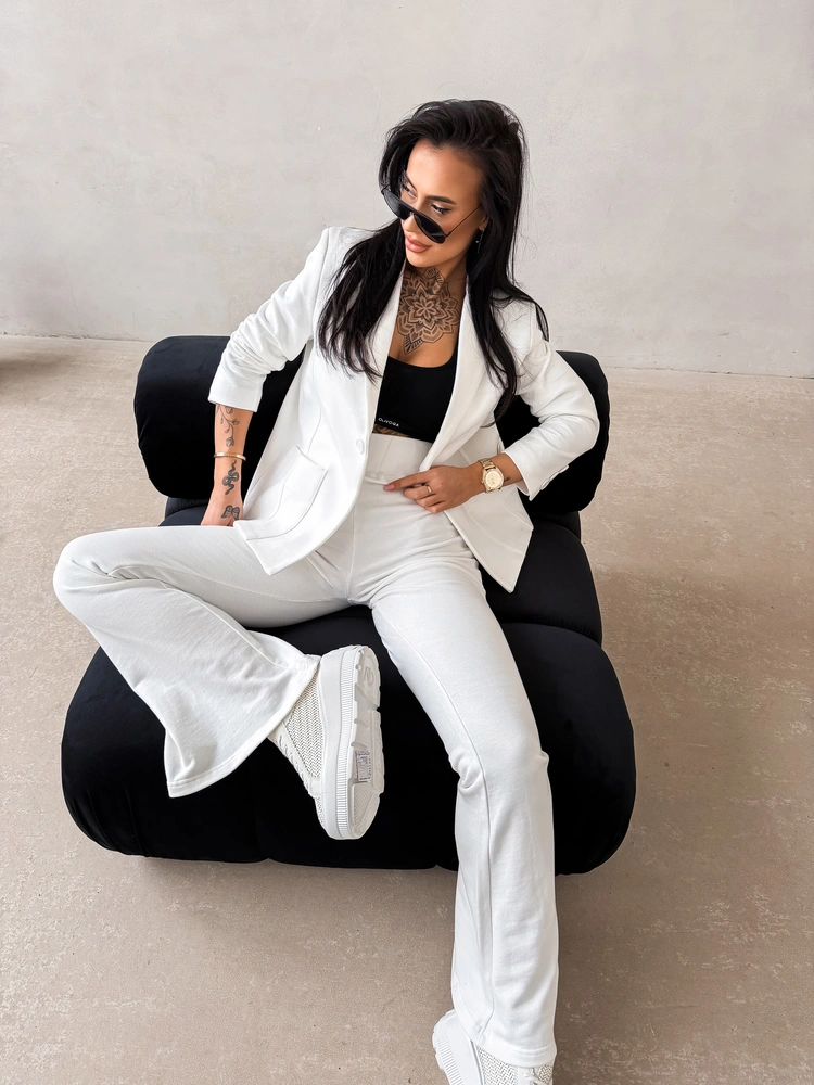Elegancki komplet o dopasowanym, kobiecym kroju wykonany z wysokiej jakości materiału. Góra – klasyczna marynarka o prostym, lekko taliowanym fasonie z klapami i kieszeniami z przodu. Dół – spodnie z podwyższonym stanem i dopasowaną linią bioder, delikatnie rozszerzane ku dołowi. Na nogawce subtelny z logo marki OLV.