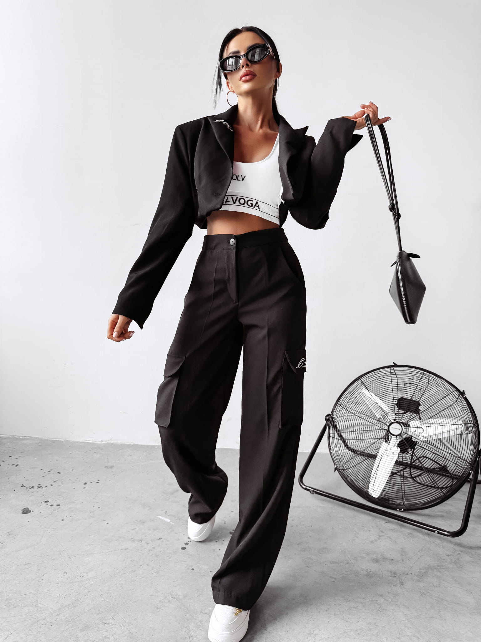 Elegancki komplet damski, wykonany z wysokiej jakości, oddychającego materiału. Góra - delikatnie oversiz’owa marynarka, o krótszym kroju. Na kołnierzu minimalistyczny, pisany haft z logo marki OLAVOGA. Na rękawach delikatne rozcięcie. Dół - spodnie typu jogger. Nogawki. rozszerzane ku dołowi. Bo bokach kieszenie. Na jednej z kieszeni minimalistyczne logo brandu.