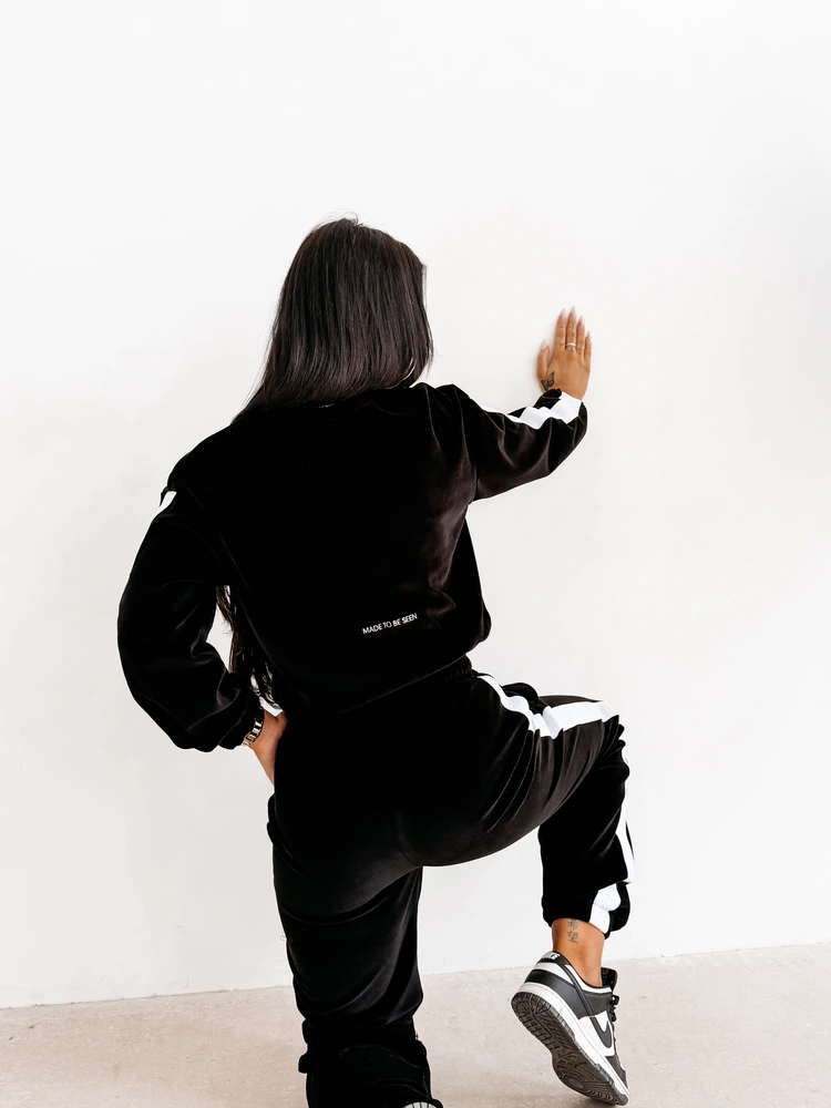 Bluza o klasycznym fasonie - wysokogatunkowy welur - okrągły dekolt - długi rękaw - ściągacze przy mankietach i u dołu - logowane lampasy - haftowane logowanie na przodzie oraz napis na plecach Made to be Seen.