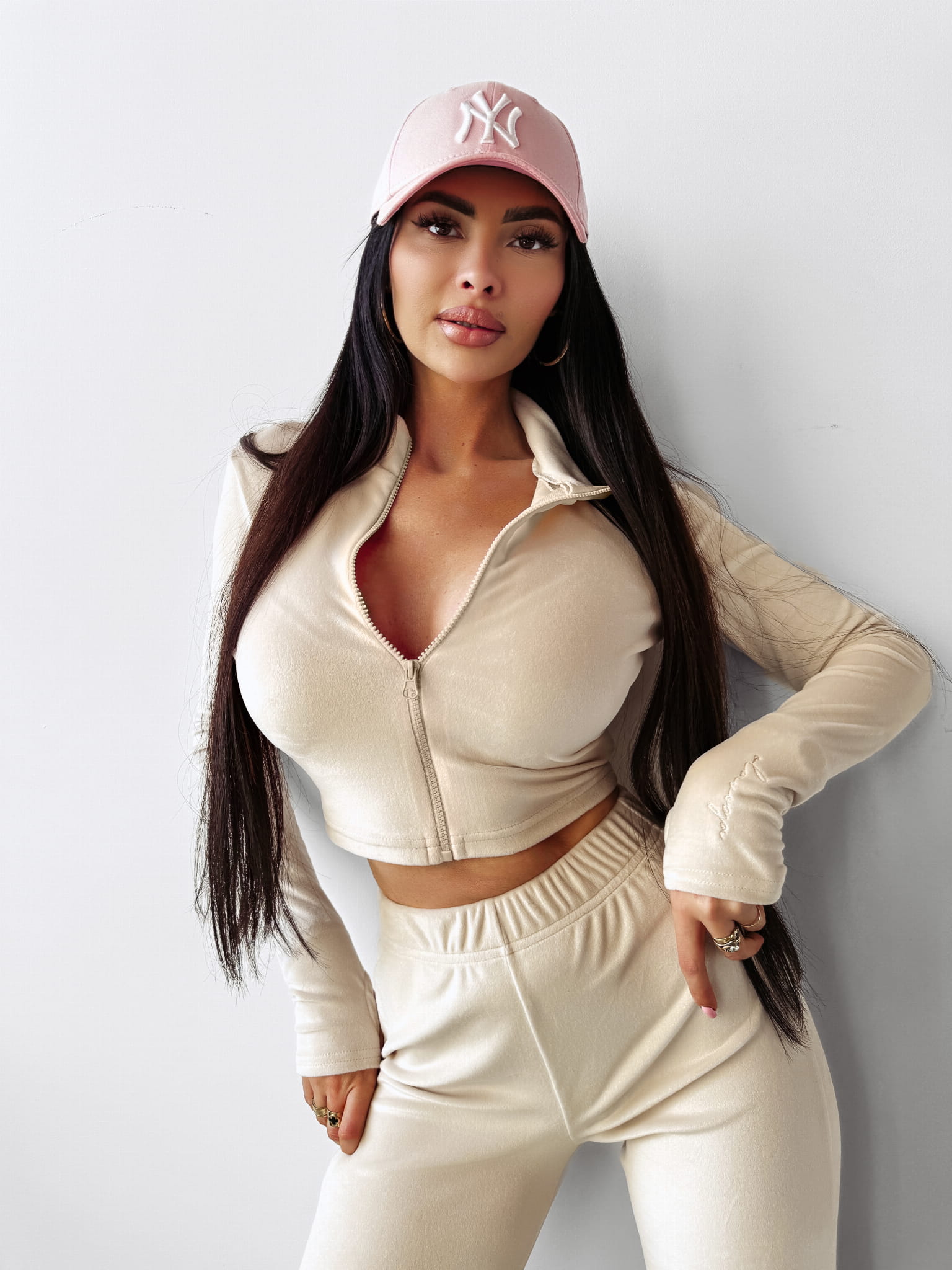 Komplet damski wykonany z miękkiego w dotyku weluru. Góra - przylegająca, rozpinana na suwak bluzka z długim rękawem. Produkt psująca wycięcie na kciuk. Na jednym z rękawów pisany, minimalistyczny haft z logo marki OLAVOGA. Dół - spodnie rozszerzane ku dołowi. Guma w talii. Produkt posiada wysoki stan. Na przodzie minimalistyczny haft z logo brandu.