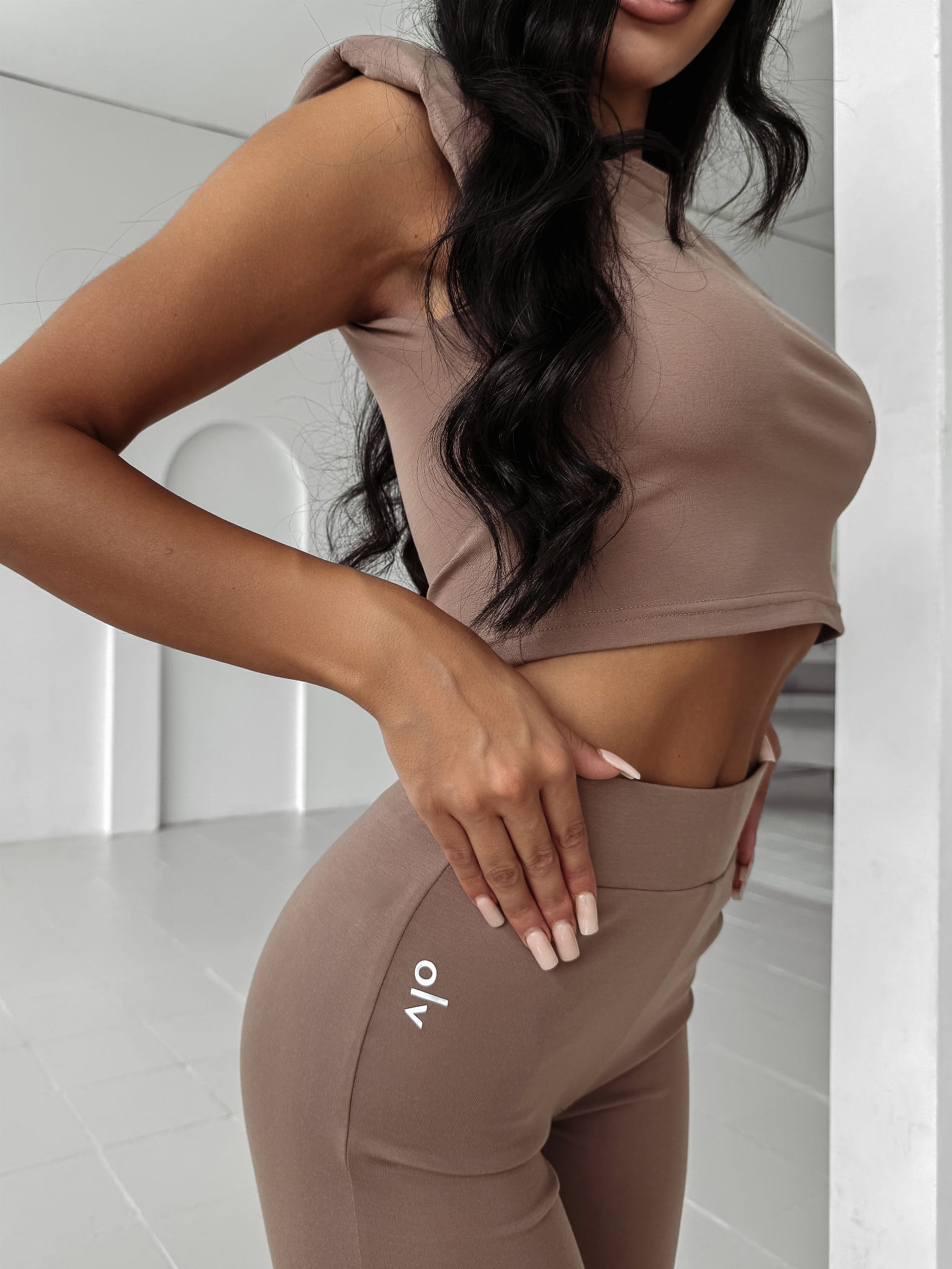 Na przodzie minimalistyczny napis OLV. Dół - idealnie przylegające legginsy. Wysoki stan. Nogawki rozszerzane ku dołowi. Guma w pasie. Na przodzie OLV.