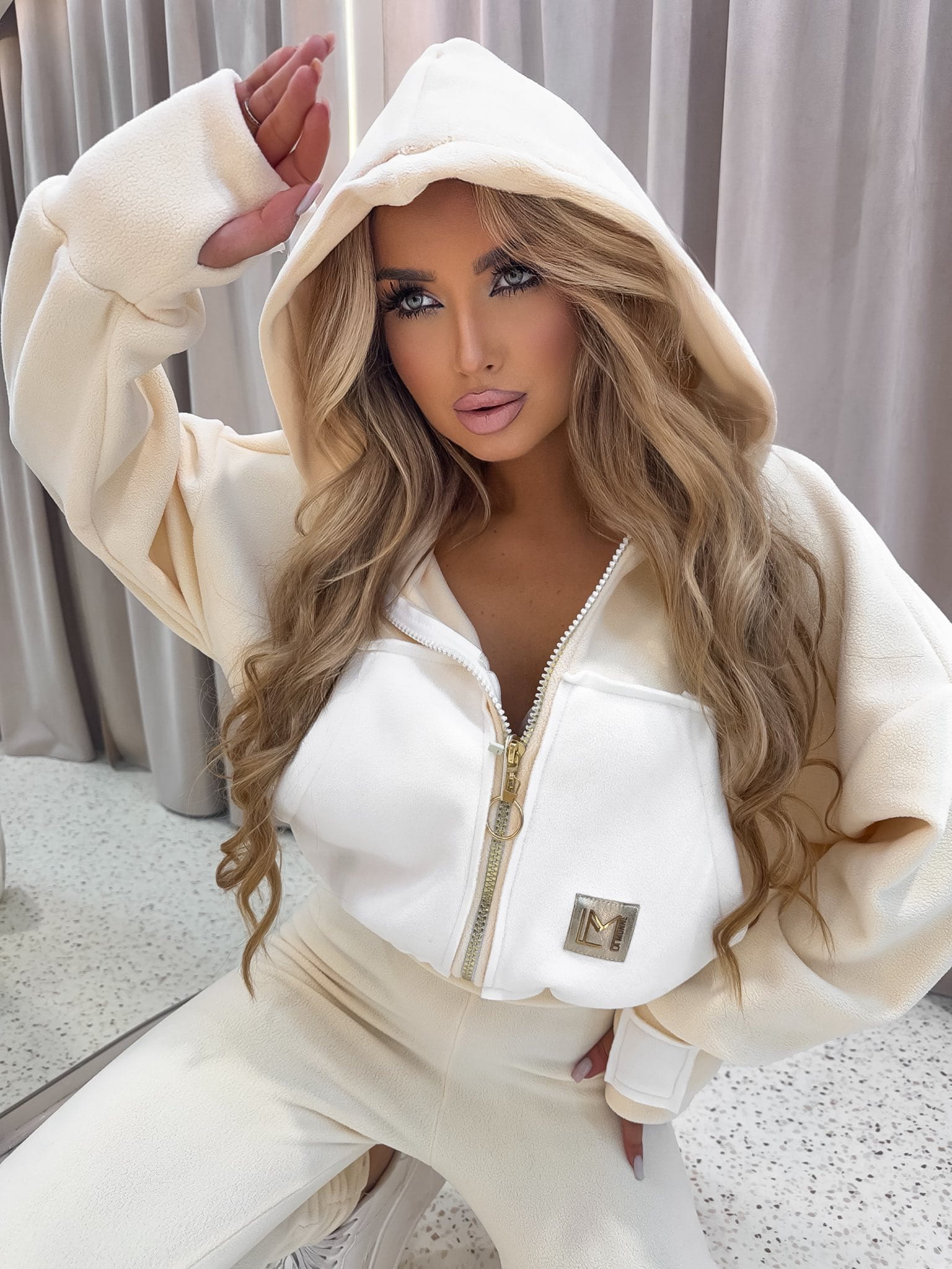 Poznaj ultra-stylowy i przytulny komplet, który łączy modny wygląd z maksymalnym komfortem. Bluza z miękkiego, pluszowego materiału z kontrastowymi, beżowymi wstawkami nadaje całości wyjątkowego charakteru. Zamek błyskawiczny oraz obszerny kaptur dodają funkcjonalności i sprawiają, że model świetnie sprawdzi się zarówno na co dzień, jak i podczas chłodniejszych dni.