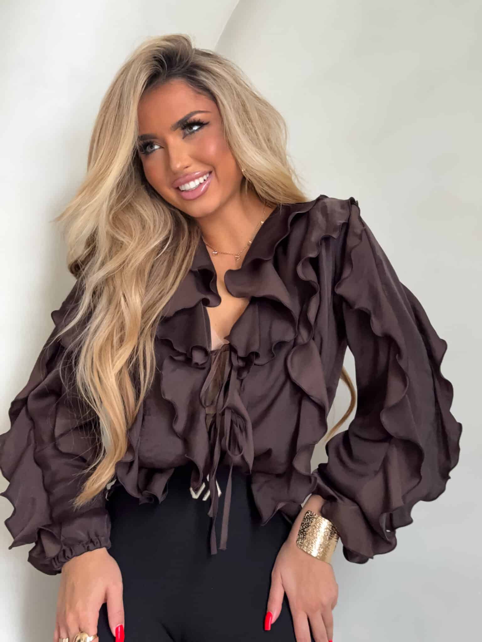 Bluzka Courtney z dużą ilością falban. Model wyróżnia się efektownym, głębokim dekoltem ozdobionym subtelnym wiązaniem na przodzie. Liczne falbany nadają bluzce lekkości i delikatnego, zwiewnego wyglądu. Rękawy są długie, luźne i zakończone miękkimi falbanami, dzięki czemu prezentują się niezwykle elegancko i swobodnie układają się przy każdym ruchu.