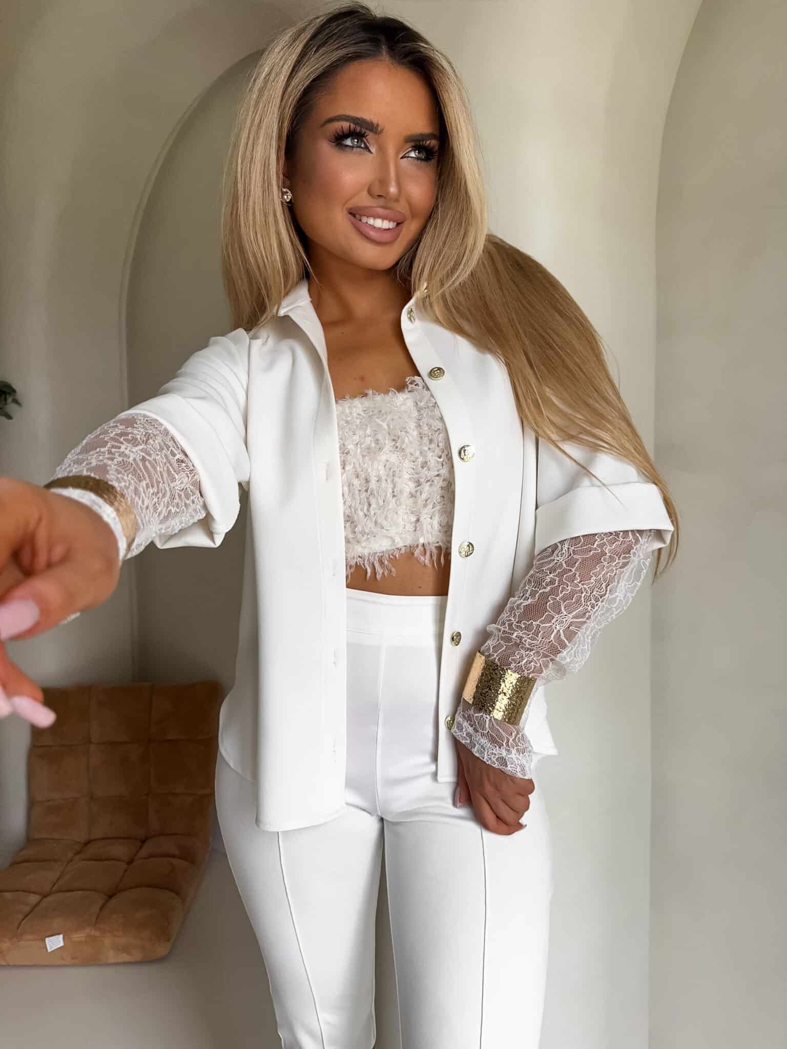Klasyczna koszula o lekko luźnym, swobodnym kroju, który zapewnia komfort i elegancki wygląd na co dzień. Model wyposażono w tradycyjny kołnierzyk koszulowy. Rękawy o długości 3/4 wykończone są efektowną wstawką z delikatnej koronki. Przód zapinany jest na eleganckie guziki. Idealna propozycja zarówno do stylizacji codziennych, jak i bardziej formalnych.