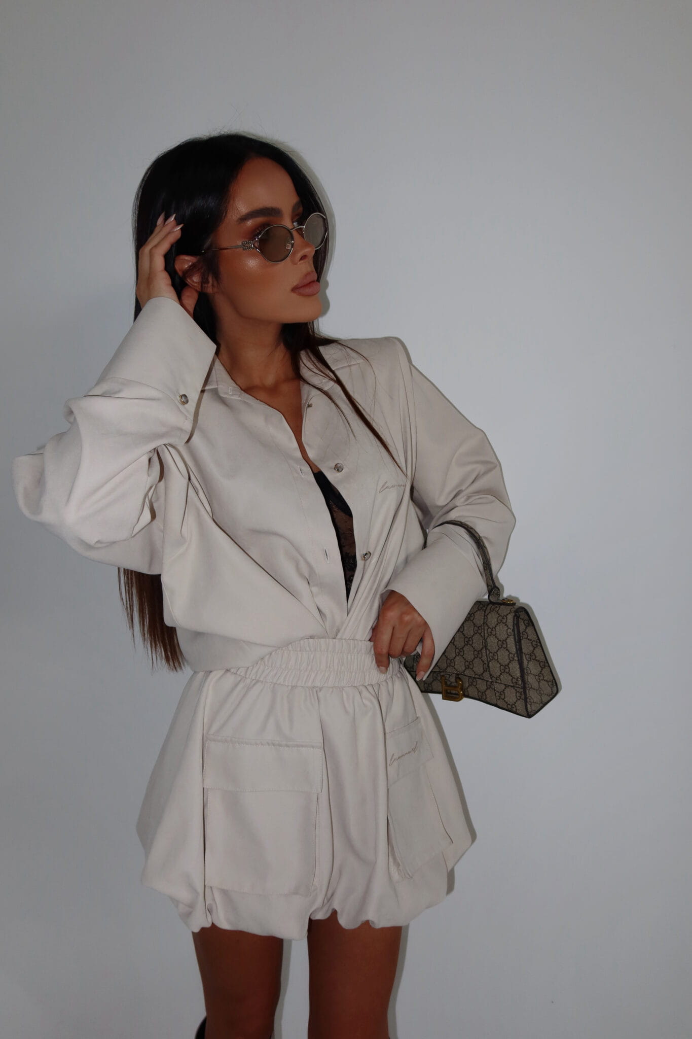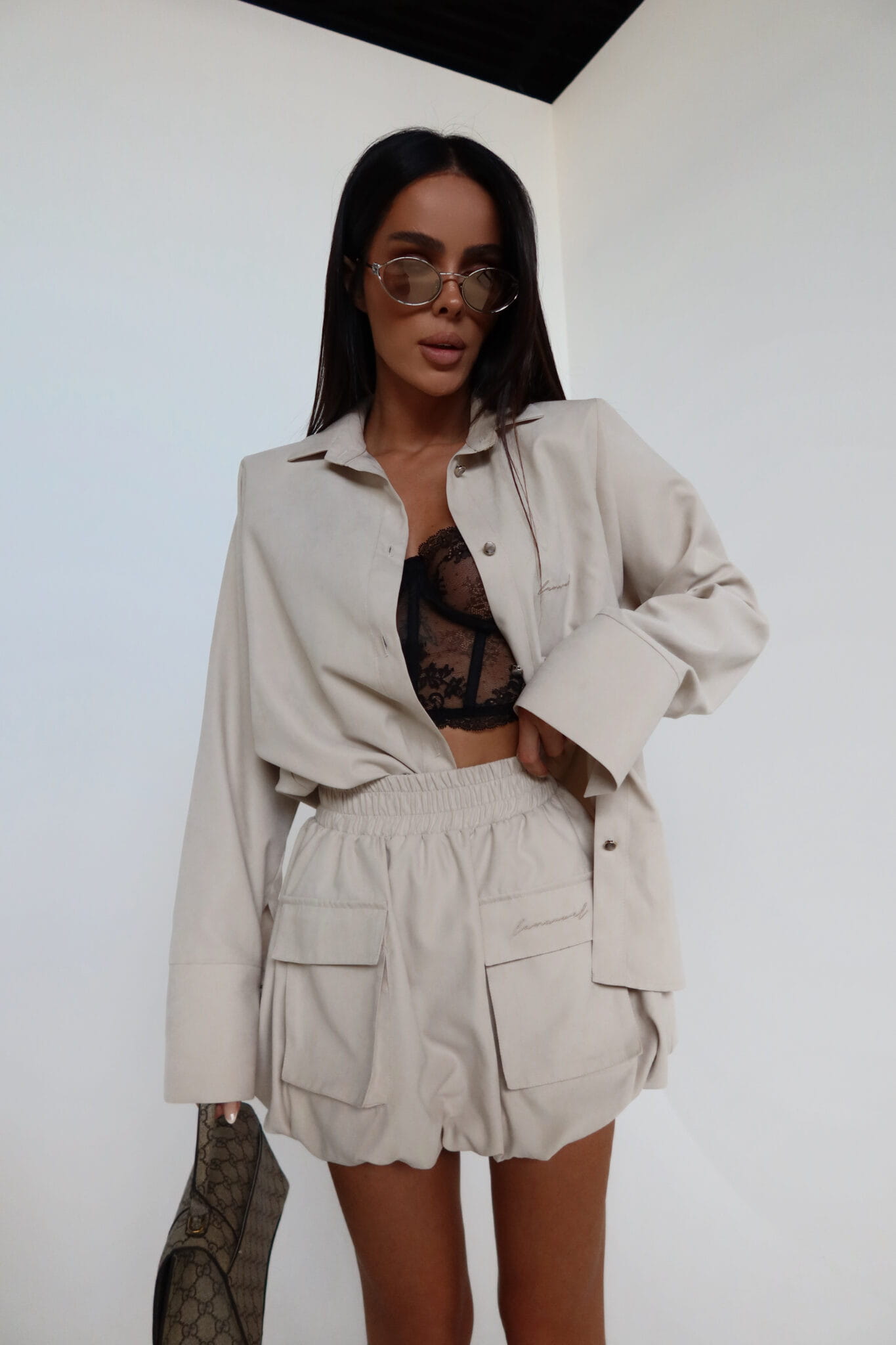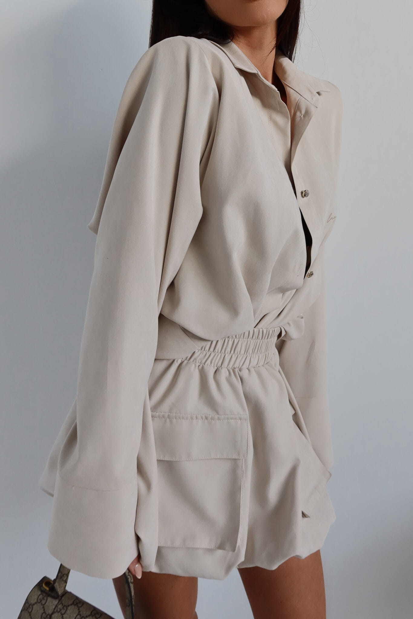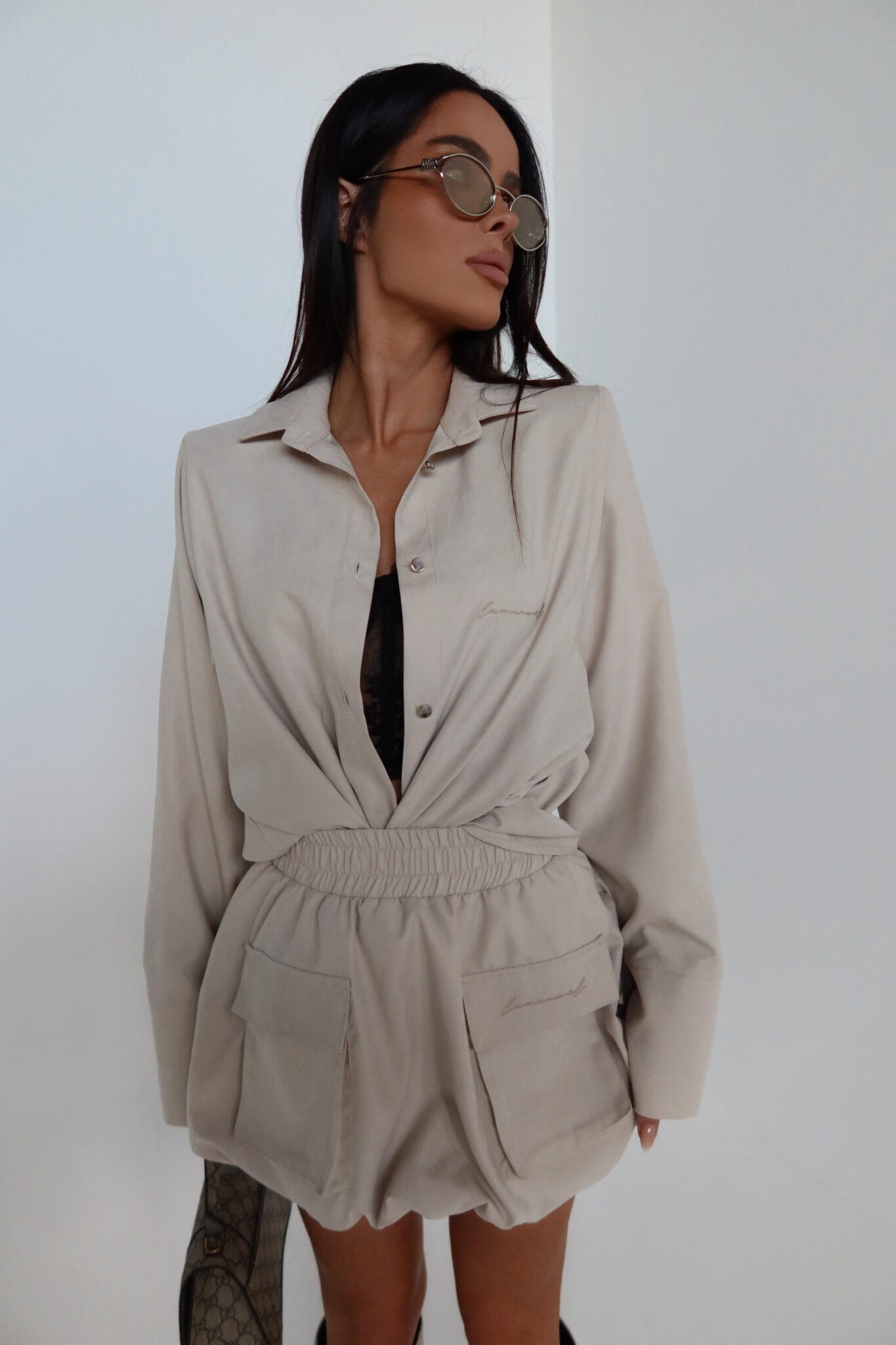 Koszula o luźnym kroju z subtelnie zaznaczoną linią ramion dzięki wszytym poduszkom. Klasyczny kołnierz i prosta forma przełamane zostały delikatnym, zamszowym wykończeniem i dłuższym rękawem z szerokim mankietem. Zapięcie na guziki oraz haftowane logo dodają całości minimalistycznego sznytu. Idealna do noszenia jako baza, ale też jako narzutka – świetnie sprawdzi się zarówno w komplecie, jak i solo.
