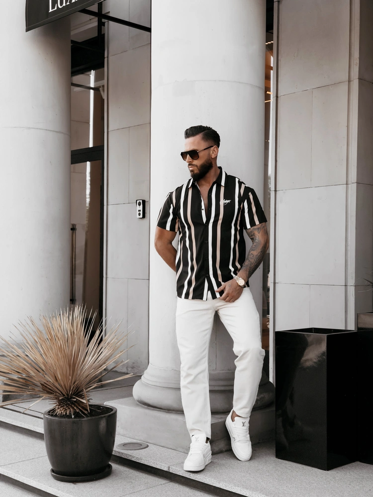 Koszula casual w stylu resort - klasyczny kołnierzyk - klasyczny krótki rękaw - zapinana na guziki - tkanina o gładkiej strukturze z pionowym wzorem z kontrastowych pasów - na przodzie logo brandu w formie haftu - proste wykończenie dołu.