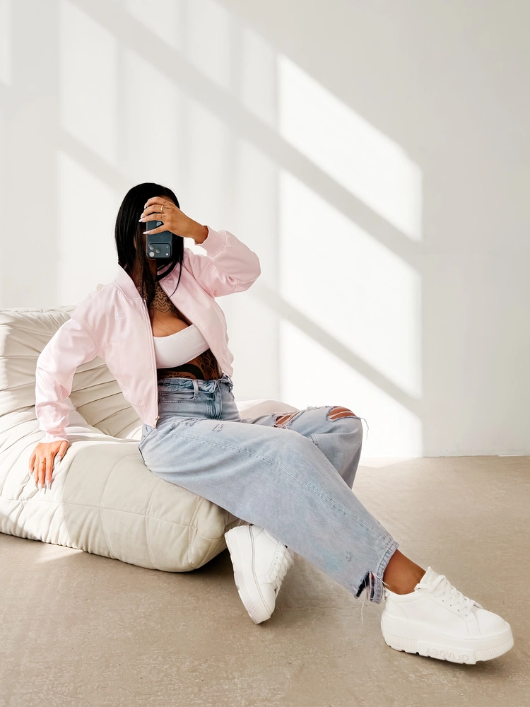 Bomberkowy krój - na podszewce - gładki lekko połyskujący materiał - zapinana na metalowy złoty suwak z logowanym pullerem - ściągacze przy rękawach, dole i przy stójce - subtelne haftowane logo na przodzie - cięte kieszenie z wypustkami na przodzie.