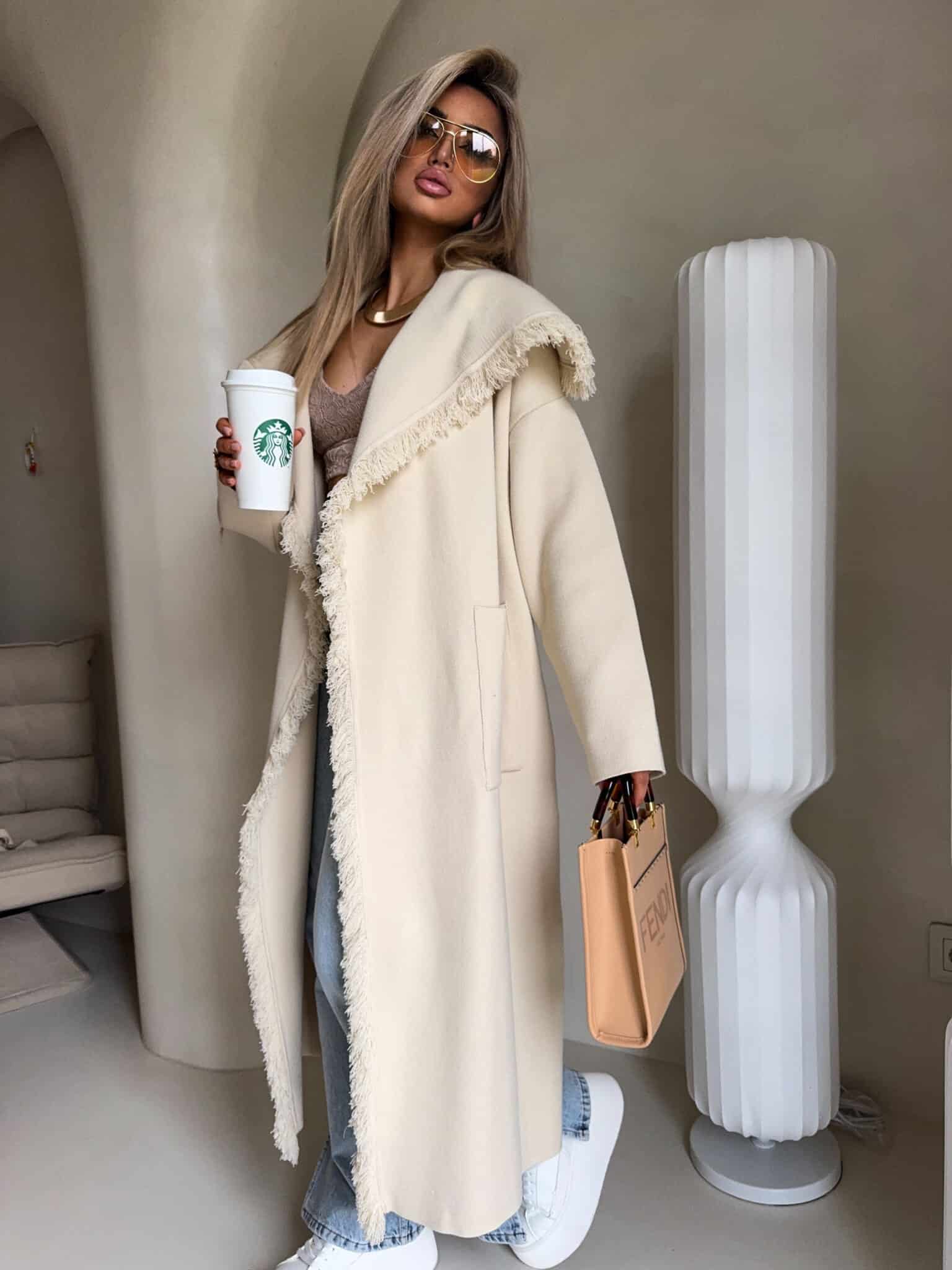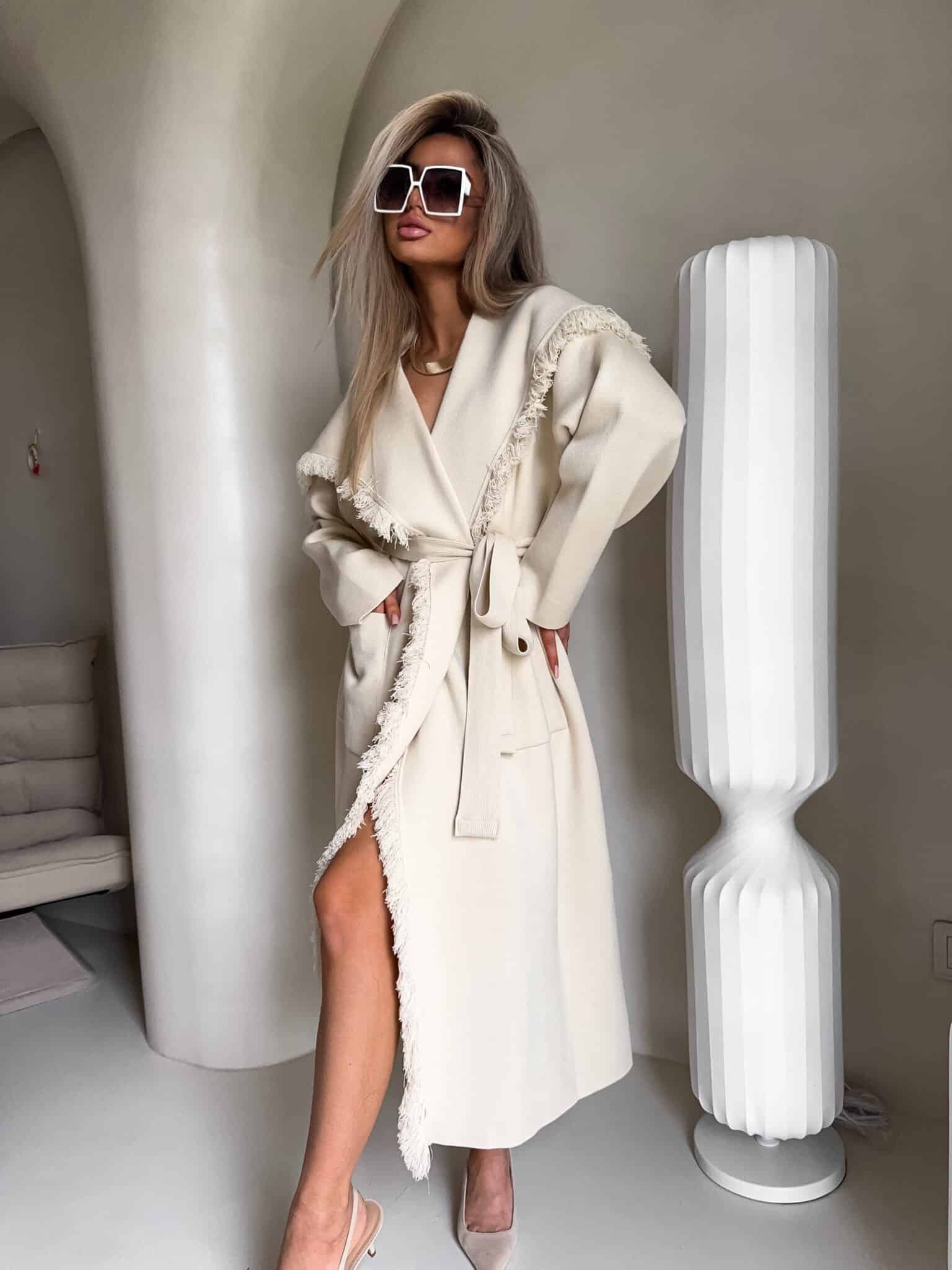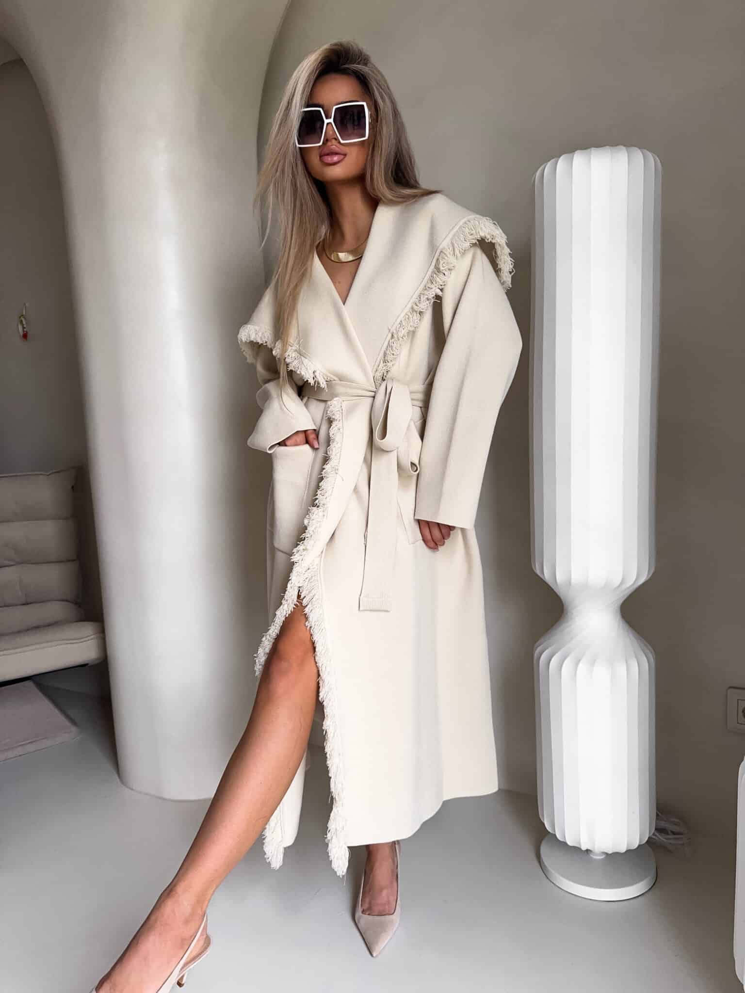 Płaszcz DIVA to model o lekko oversize’owym kroju, wiązany w pasie szerokim paskiem, który pięknie podkreśla talię i pozwala dopasować sylwetkę do własnych preferencji. Długość sięgająca za kolano. Szeroki, opadający kołnierz został ozdobiony dekoracyjnymi strzępieniami, które pojawiają się również wzdłuż zapięcia oraz na dole płaszcza. Po bokach znajdują się praktyczne, wpuszczane kieszenie.
