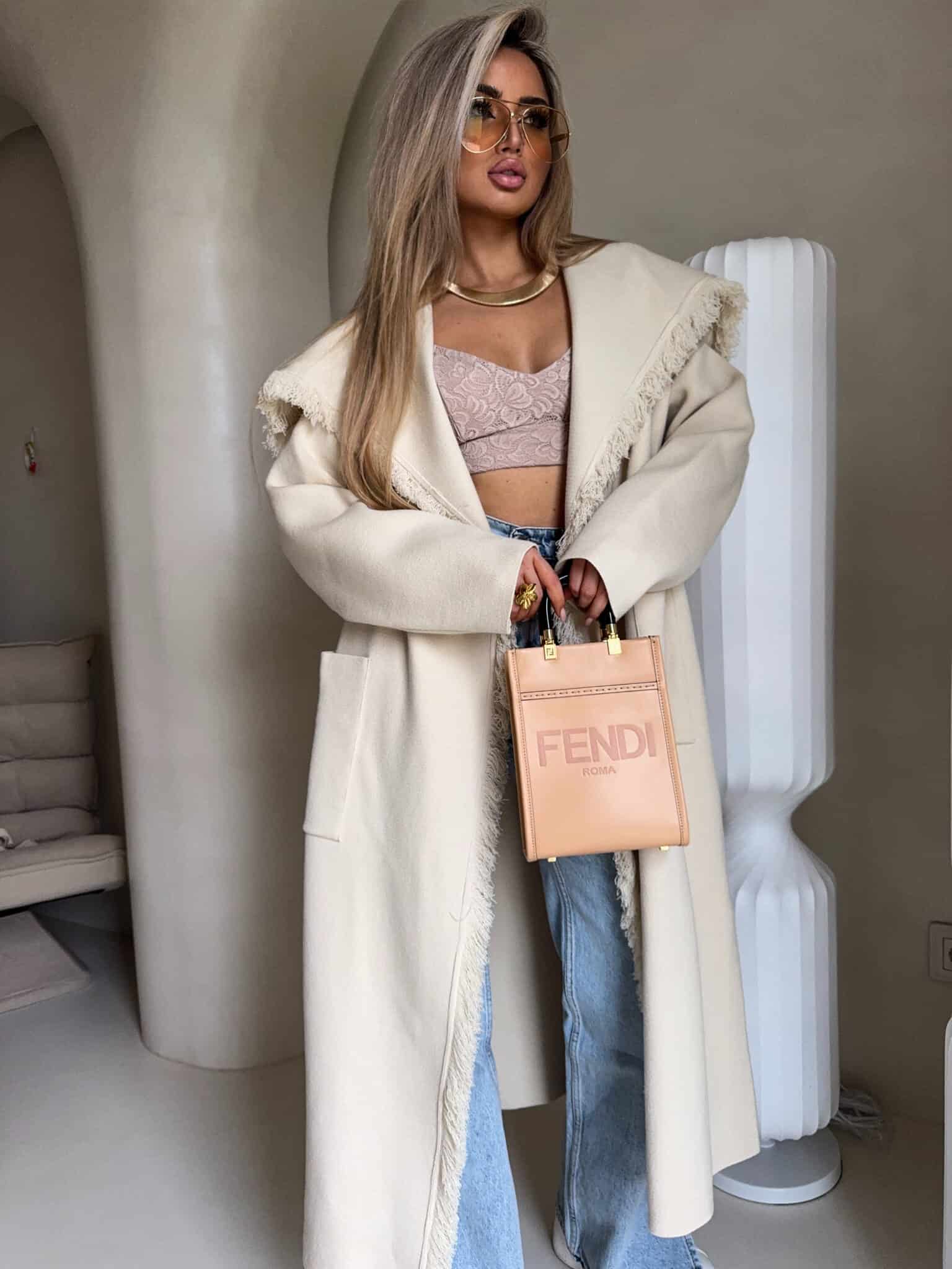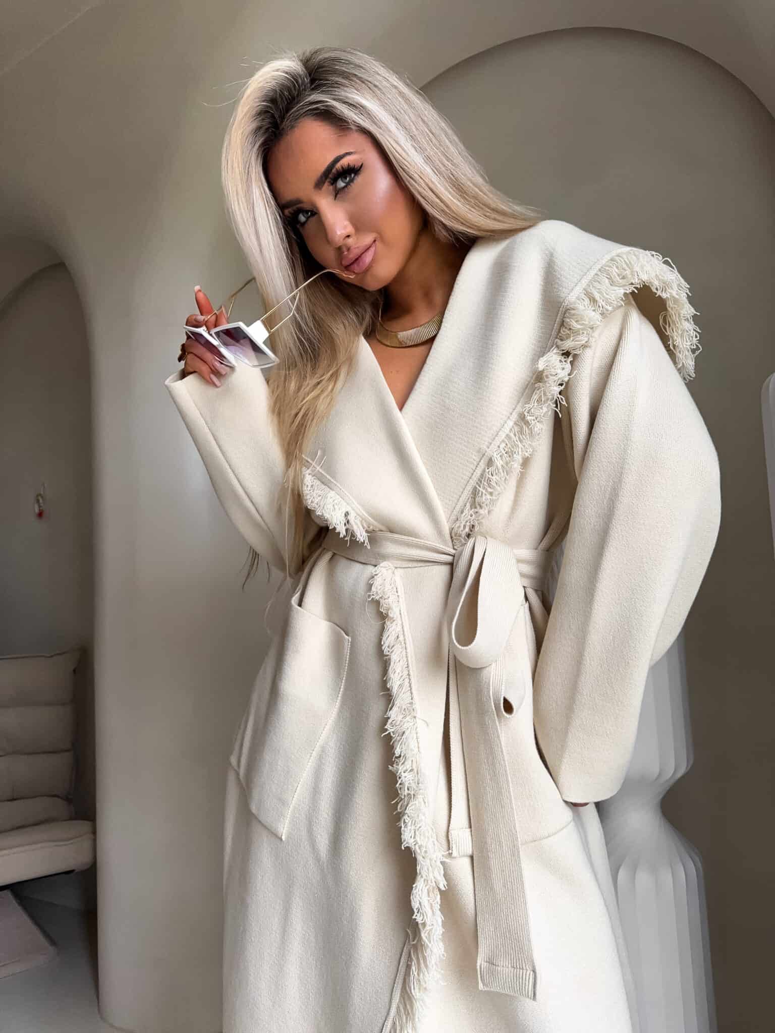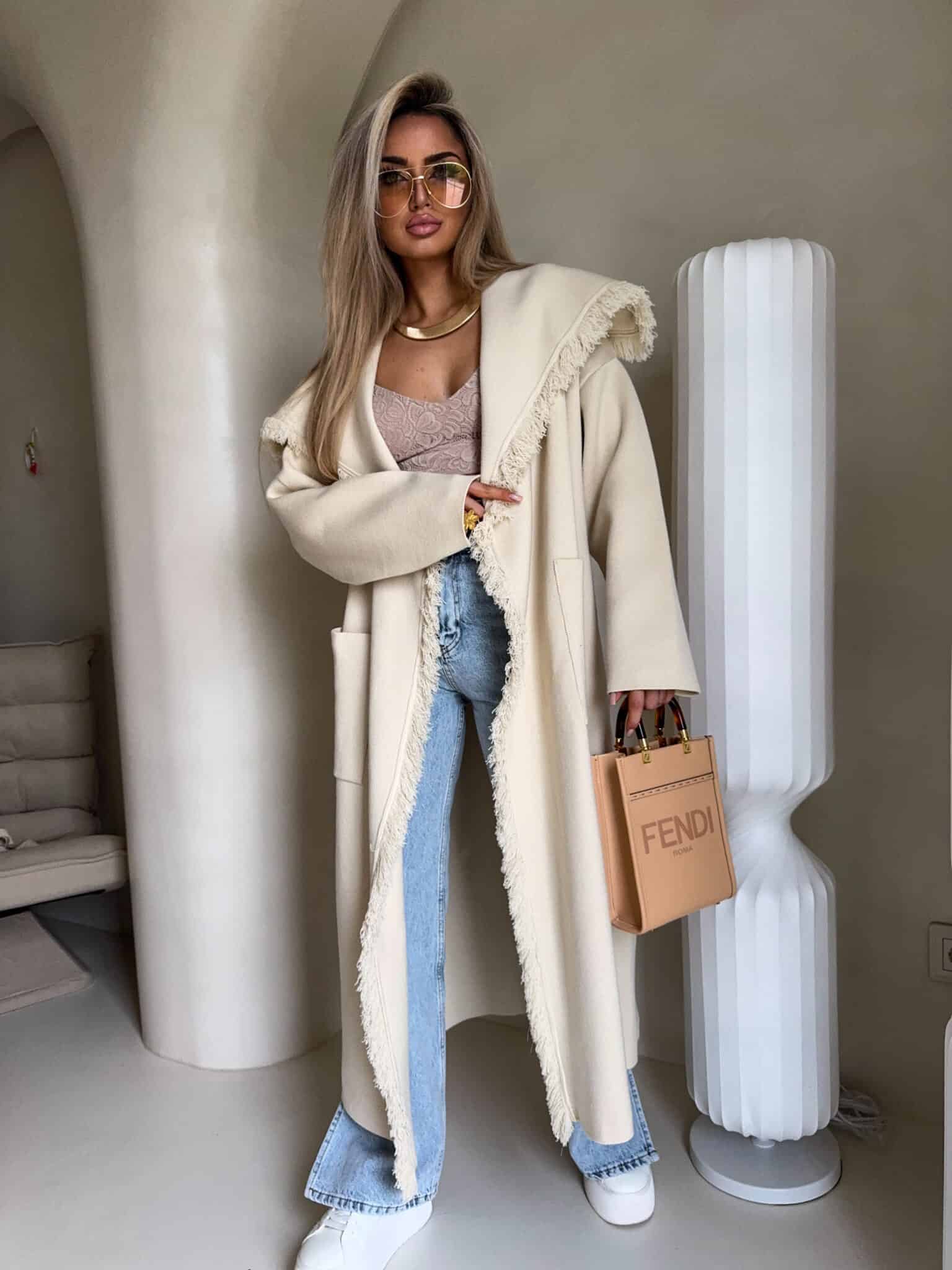 Płaszcz DIVA to model o lekko oversize’owym kroju, wiązany w pasie szerokim paskiem, który pięknie podkreśla talię i pozwala dopasować sylwetkę do własnych preferencji. Długość sięgająca za kolano. Szeroki, opadający kołnierz został ozdobiony dekoracyjnymi strzępieniami, które pojawiają się również wzdłuż zapięcia oraz na dole płaszcza. Po bokach znajdują się praktyczne, wpuszczane kieszenie.