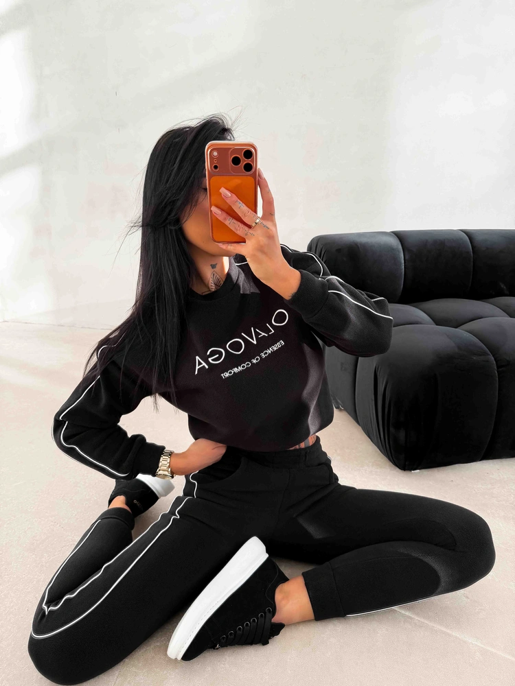 Casualowy komplet wykonany z miękkiego, przyjemnego w dotyku materiału typu polar, o delikatnej, jednolitej strukturze. Góra – bluza o klasycznym kroju z okrągłym dekoltem. Model z długim rękawem, wykończonym elastycznymi ściągaczami. Na przodzie subtelny, tłoczony haft z logo marki OLAVOGA oraz hasłem ,,ESSENCE OF COMFORT”. Wzdłuż rękawów delikatne kontrastowe lampasy. Dół – spodnie z elastycznym pasem, o prostych nogawkach zakończonych ściągaczami. Model wyposażony w boczne kieszenie. Na nogawce umieszczone subtelny haft z logo brandu. Na tyle znajduje się przeszycie. Produkt stworzony z myślą dla Niej i dla Niego.