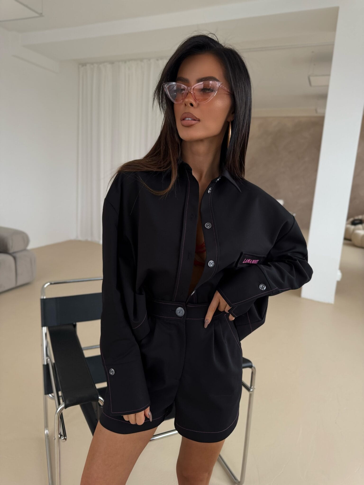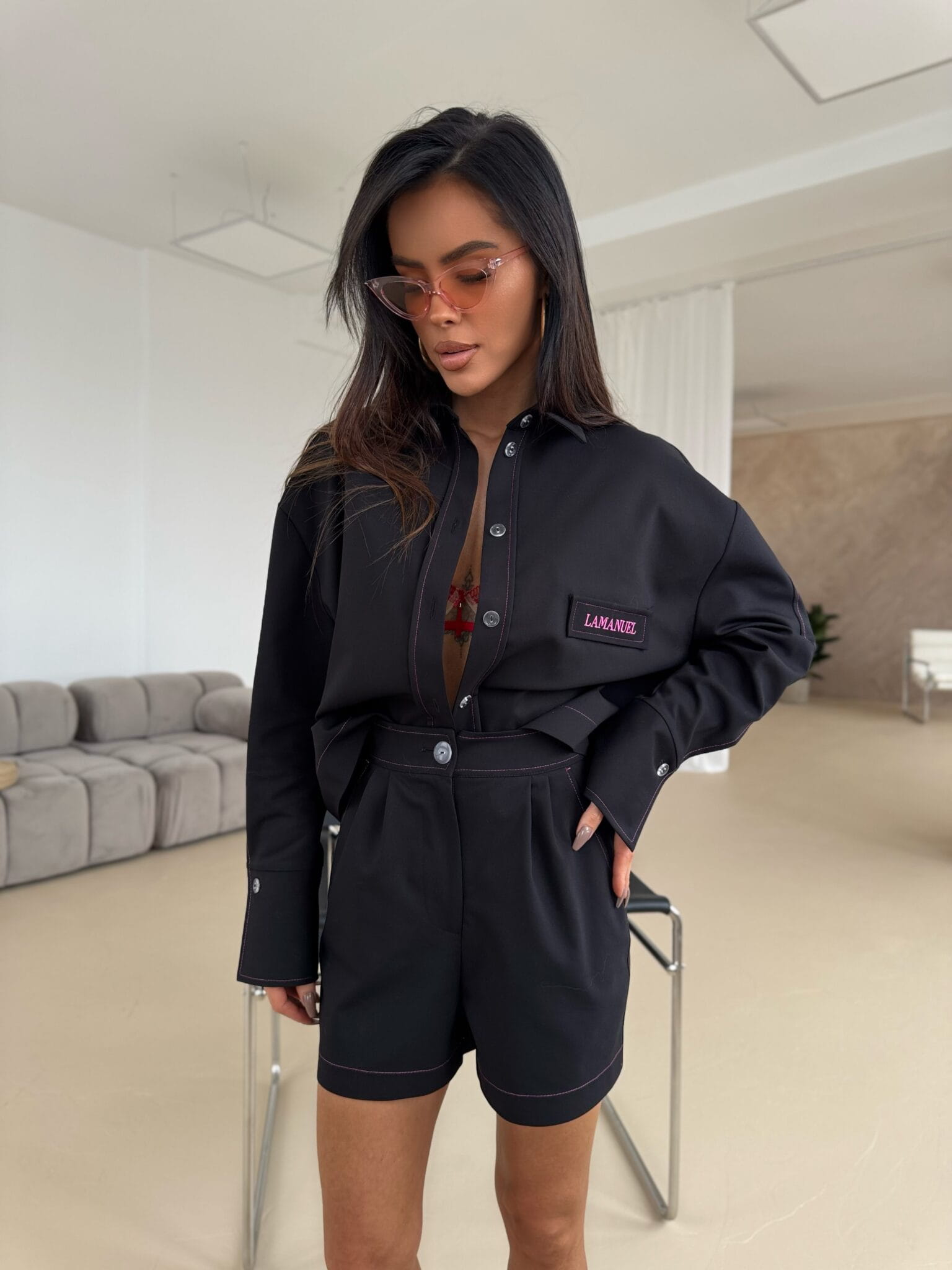 Szorty o eleganckim, a jednocześnie swobodnym kroju z wysokim stanem, podkreślającym talię. Wykonane z wysokiej jakości tkaniny, która zapewnia komfort noszenia i estetyczny wygląd. Charakterystycznym elementem projektu są kontrastowe przeszycia wykonane kolorową nicią, które dodają unikalnego akcentu i podkreślają konstrukcję szortów. Boczne kieszenie wykończone solidnymi ryglami zapewniają trwałość, a tylne, subtelnie wszyte kieszonki dodają klasycznego wykończenia. Szorty zapinane na guzik i zamek, z precyzyjnym dopracowaniem detali. Idealnie sprawdzą się w casualowych stylizacjach, jak i bardziej eleganckich zestawieniach. Można je łączyć zarówno z koszulą, jak i luźnym t-shirtem dla różnorodnych efektów stylizacyjnych.