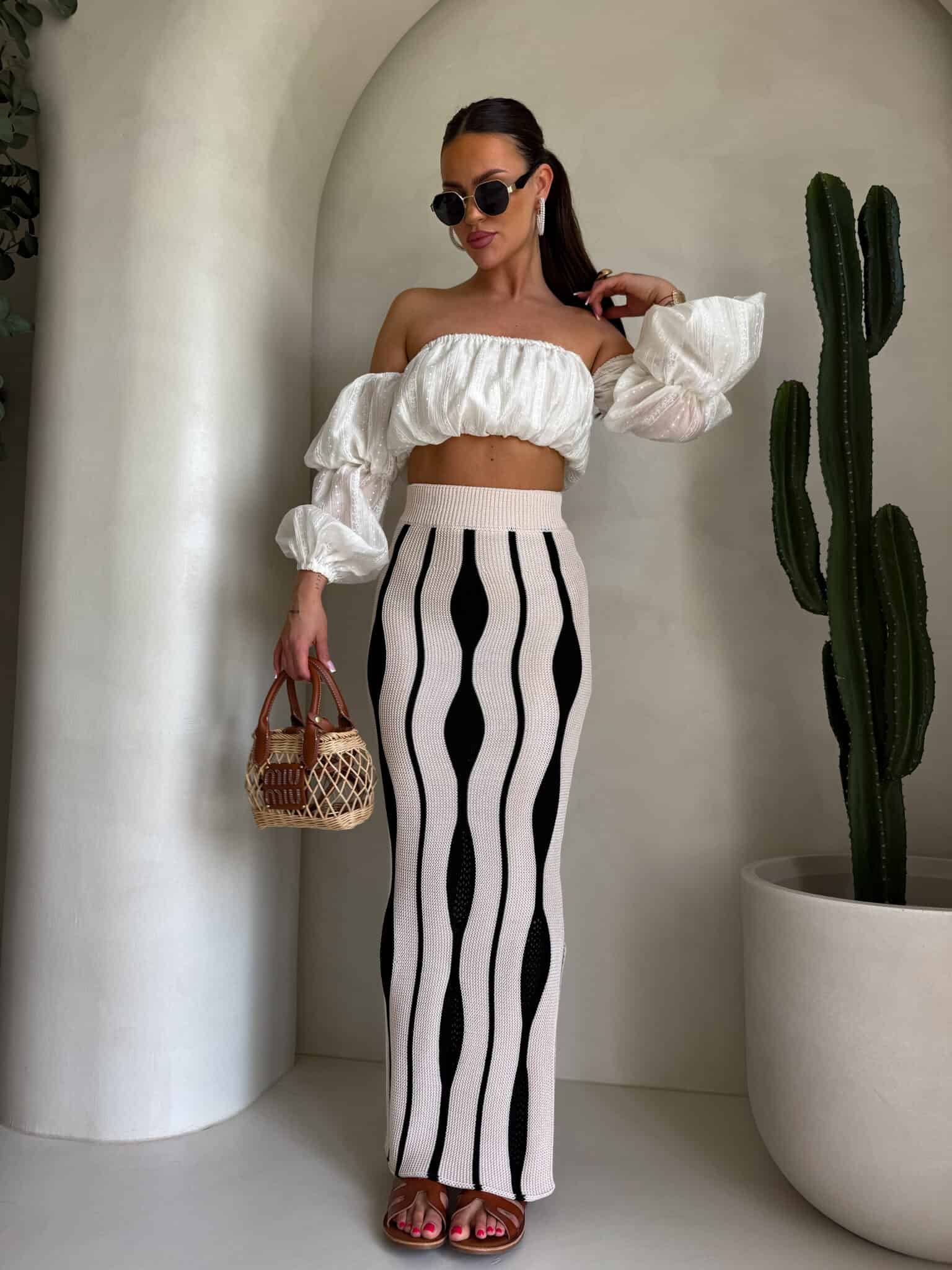 Długa, sięgająca kostek spódnica, o dopasowanym kroju typu ołówkowego, który podkreśla sylwetkę. Wykonana jest z dzianiny o wyraźnej, lekko fakturowanej strukturze. Dominują dwa kolory – ułożone w pionowy, falujący wzór. Linie są nieregularne i optycznie wydłużają figurę, dodając całości nowoczesnego, nieco artystycznego charakteru. Spódnica ma wysoki stan z szerokim, elastycznym pasem, co zapewnia wygodę i dobre dopasowanie w talii.
