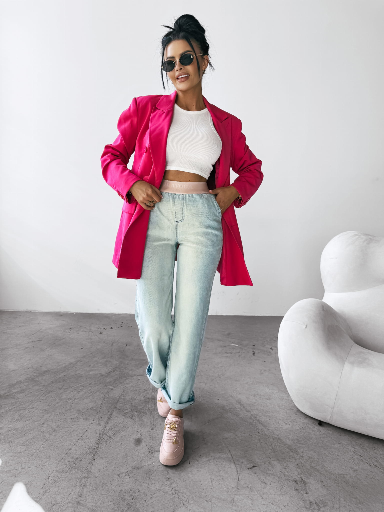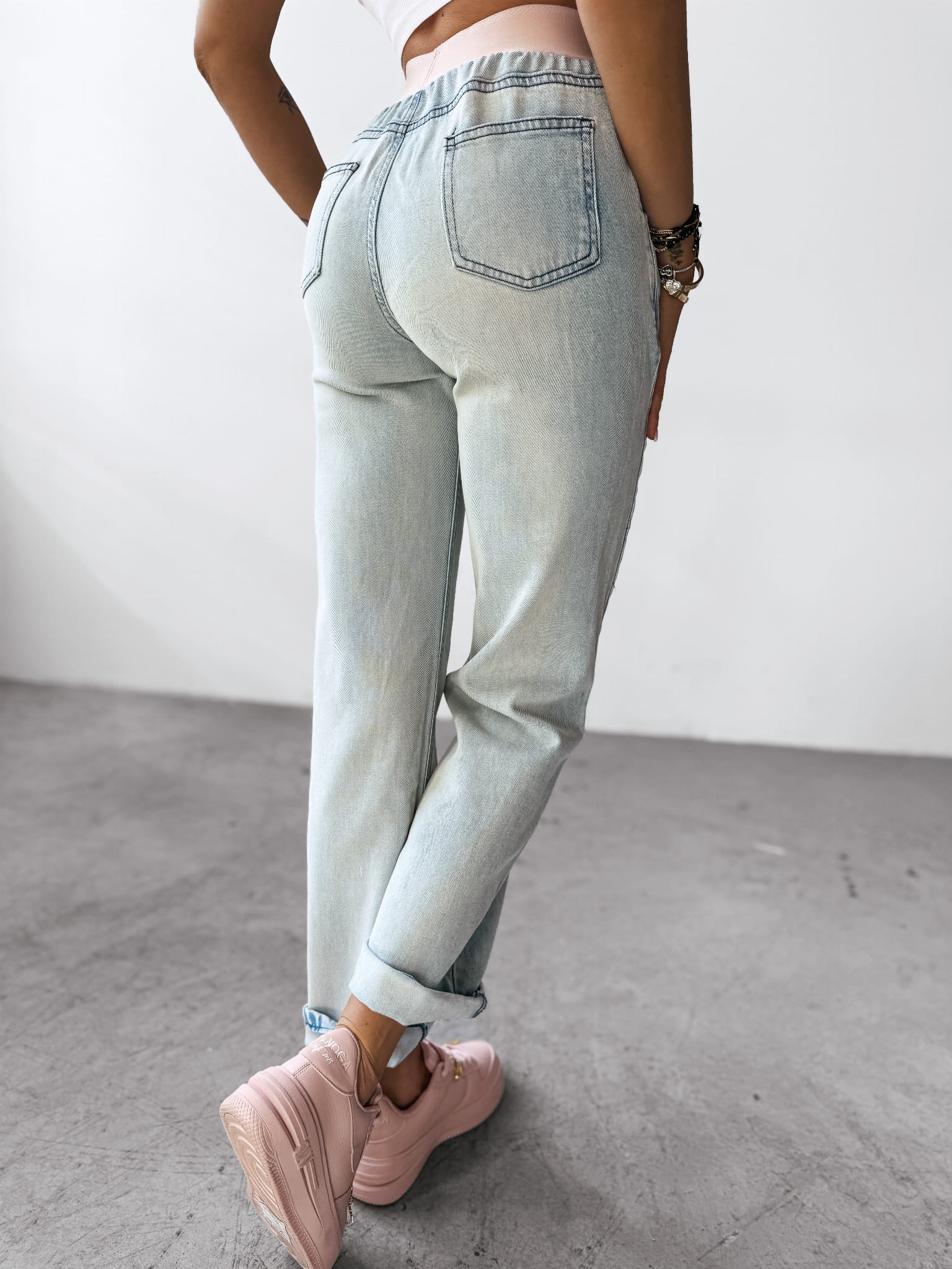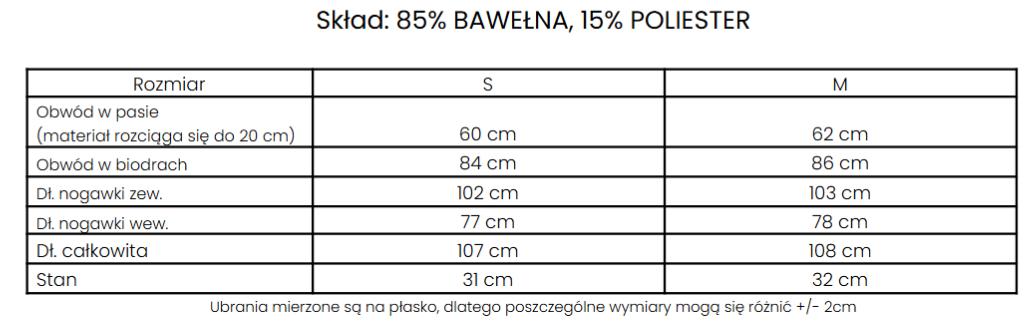 kieszenie. Logowana guma w talii. Wysoki stan. Nogawki delikatnie rozszerzane ku dołowi.