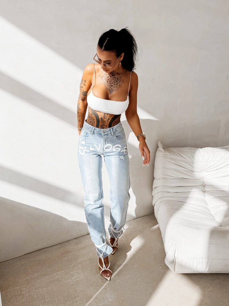 Dopasowany krój o prostej nogawce - wysokiej jakości denim - klasyczny fason - zapięcie na logowany guzik i zamek - klasyczny układ kieszeni - przetarcia - nadruk OLAVOGA na przodzie - naszywka z logo z tyłu pasa.