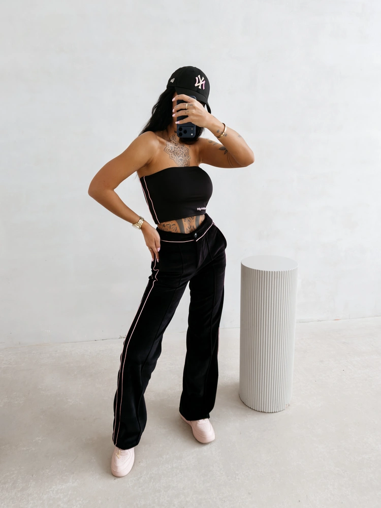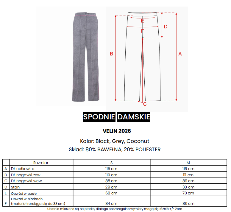 Spodnie o luźnym, prostym kroju, wykonane z miękkiego, przyjemnego w dotyku materiału o welurowym wykończeniu. Model z wysokim stanem, zapinany na guzik oraz suwak, z dodatkowym wiązaniem w pasie zakończonym metalowymi oczkami i satynową tasiemką. Wzdłuż nogawek subtelne, kontrastowe lampasy. Na nogawce delikatny haft z logo marki OLAVOGA. Tworzą idealny komplet z topem LEYA i bomberką ELVIA.